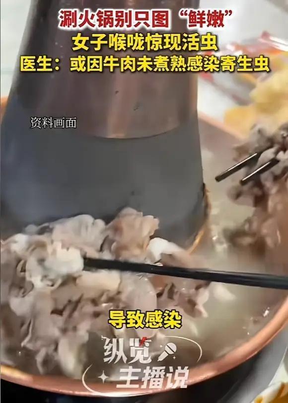“太吓人了!”湖北襄阳,一女子吃火锅时,觉得牛肉煮太久了不新鲜,于是在锅内涮了几秒就拿出来吃,吃完后,觉得嗓子不太舒服,还有刺痛感,于是去医院检查,没想到结果显示她喉咙里面竟然有一条活虫!网友:再也不吃三分熟了! 女子当时觉得牛肉烫久了口感会变老,追求鲜嫩,只在滚汤里快速晃动了几下,肉片还带着粉红色就送进了嘴里。她没吃出什么异味,但没过多久,喉咙就像有根细刺扎着,又痒又痛。 她以为是被烫到了,或者辣椒卡住了,喝了点凉水想缓解。可那种异物感一直没消失,反而越来越明显,总觉得有什么东西在爬。她心里发毛,赶紧去了医院。 医生用喉镜仔细检查,在她喉咙深处真的发现了一条还在轻微蠕动的活虫!这虫卵很可能就潜藏在没有完全烫熟的牛肉里,随着她咀嚼吞咽,活生生地附在了咽喉黏膜上。 女子看着取出的虫子,后怕得浑身起鸡皮疙瘩。她追求的“几秒鲜嫩”,差点酿成大祸。牛肉等肉类可能携带细菌、寄生虫卵等,如果加热不彻底,这些微生物和虫卵可能未被完全杀灭。例如,布鲁氏菌在100°C下需要1-5分钟才能被完全杀灭,短暂的涮烫可能不足以确保安全。 薄切的牛肉卷、羊肉卷,至少在沸腾的汤底里滚烫1分钟以上,看到肉片完全变成灰白色,才能放心吃。千万不要为了追求一时的口感,去模仿所谓的“七上八下”“三提三摆”。 美食是为了享受生活,别因为一时疏忽,让享受变成受罪。安全永远比口感重要。 各位读者你们怎么看?欢迎在评论区讨论。 信息来源:《女子吃完火锅后,喉咙有刺痛感,就医后发现喉咙里有一只阔盘吸虫成虫。》纵览新闻