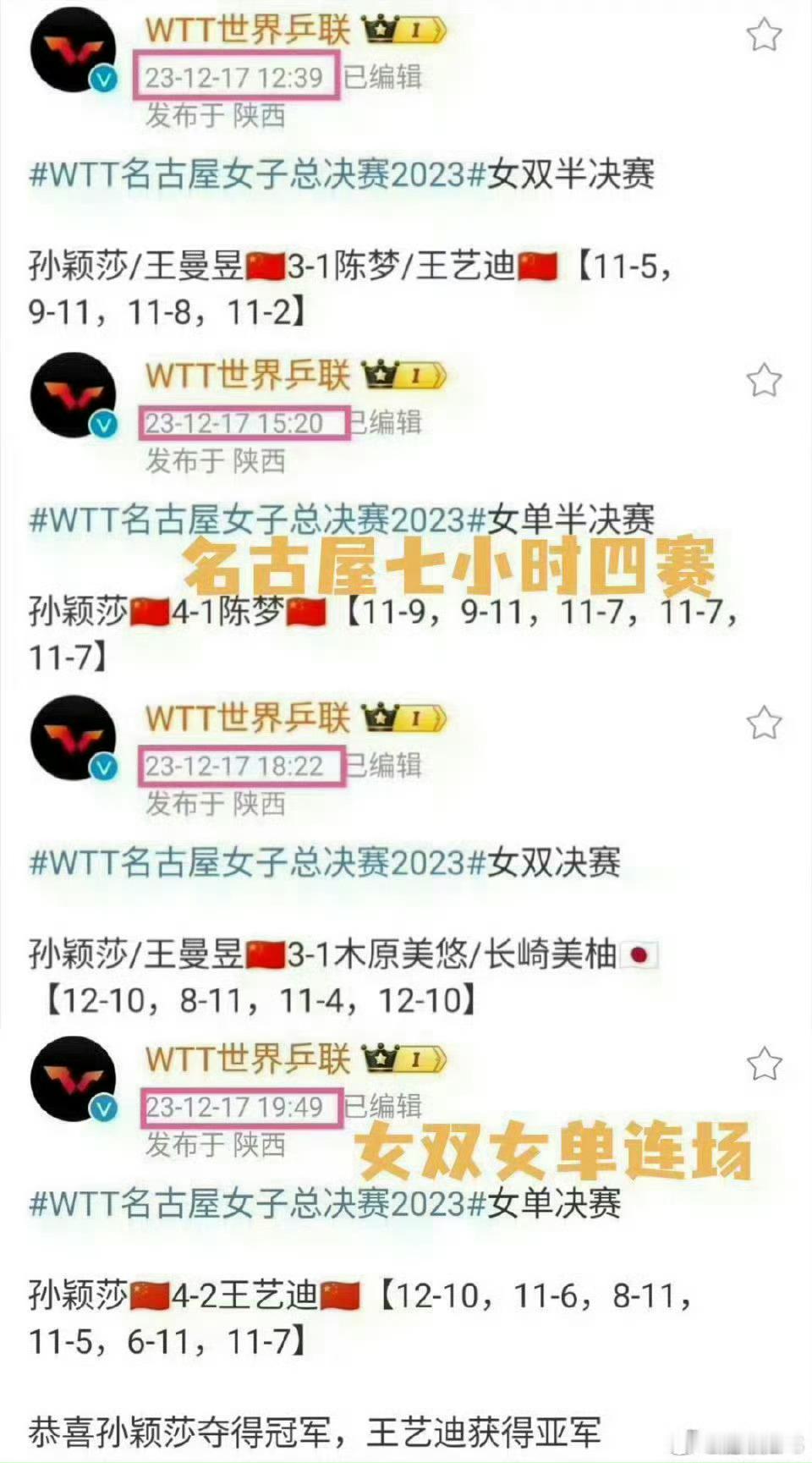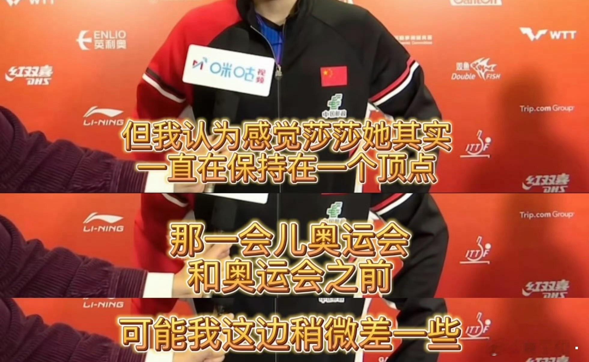 孙颖莎说确实也配合了8年了就是日复一日,年复一年孙颖莎辛苦了,所有参赛运动员里唯一一日三赛,下午混双半决赛14:50结束,晚上女单半决赛19:30,混双决赛21:00,女单半决赛和混双决赛仅仅间隔一场比赛。兼项已是不公平竞争,请合理安排孙颖莎赛程,做好运动员各项保障!新周期培养新混双组合共同承担集体责任是破局关键!