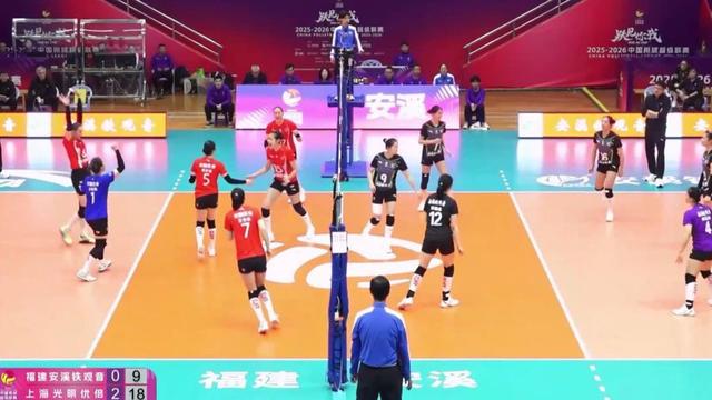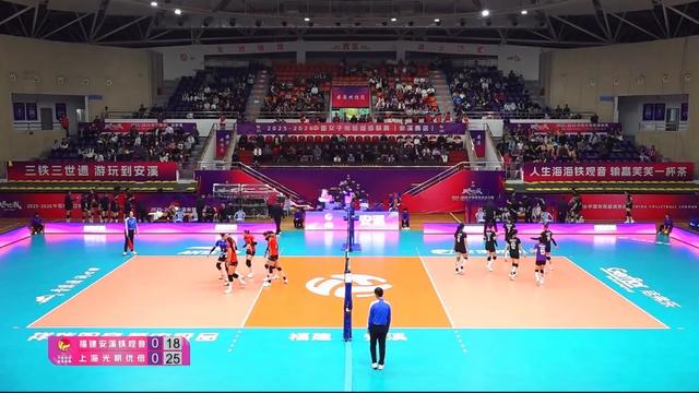 首局比赛,双方都有些拘谨,没能很快进入比赛状态。中局阶段,上海队利用防守反击连续得分,加上福建队连续出现失误,分差被拉开。一番争夺后,上海女排以25:18赢下首局。