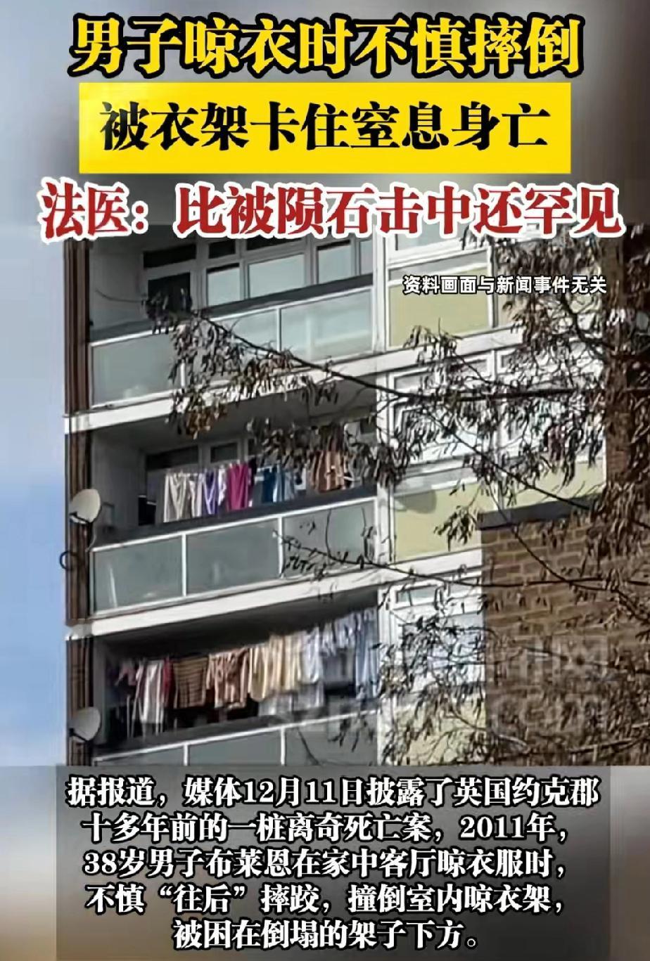 死神来的时候,连招呼都不打。男子摔个跤就把自己给摔死了,专家说,这机会比陨石击中的概率还要低。 最近,有媒体披露,在十多年前,英国约克郡,有位男子在客厅晾衣服时,自己不小心朝后跌倒,一下子把晾衣架碰到。也不知道怎么那么巧,晾衣架正好卡住了他的脖子,结果自己被卡,窒息而死了。 这宗离奇命案,让专家都惊叹!说这比雷击或陨石击中都要罕见,是这辈子都没遇到过的事情。 你说玄不玄。中国有句老话,“阎王让你三更死,无人能留到五更。”真是世事无常啊! 所以,人生最重要的事,就是活好当下,该吃吃,该喝喝,啥也别往心里搁,该干么就尽心尽力地干就是了,该休息就休息,不纠结,不拧巴,但行好事,莫问前程! 图片来自网络,侵删致歉!
