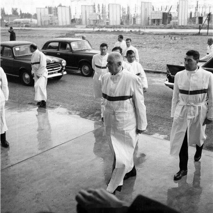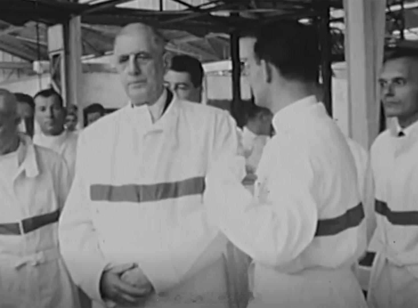 老照片 中,是法国历史性的时刻。戴高乐将军,造访位于皮耶尔拉特的军用铀浓缩工厂——当时被称为“核能大教堂”的国家重地。据当时的法国媒体报道:“在重重封锁与压力之下,法国成为少数完全依靠自身力量掌握核武技术的国家。一位出生于19世纪、由战争塑造的国家领袖,从一辆标致403轿车中走出,身穿白色工作服,仿佛仪式性的祭袍,将核能——这一现代文明之火——正式交付给法兰西。”法兰西的故事