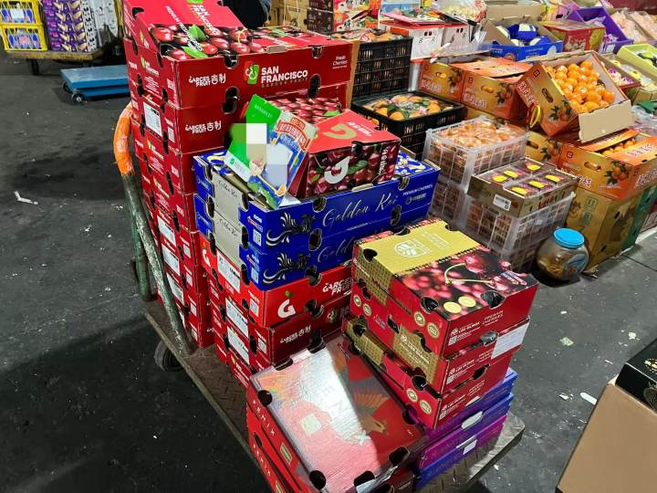 今天记者在浙江文晖果品市场看到,不少水果摊位都摆放着一箱箱的进口车厘子。