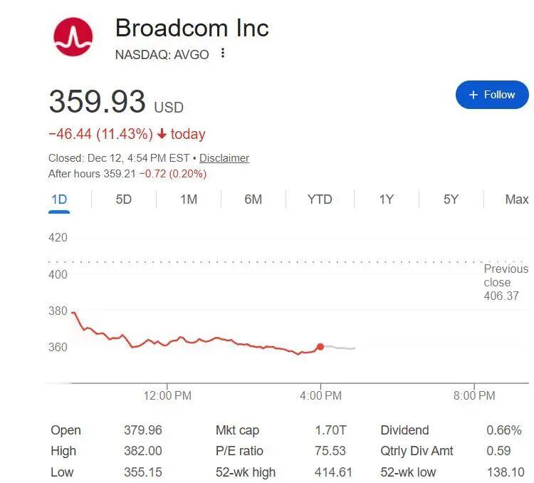 尽管业绩强劲,博通周五股价刷新日低时盘中跌近12%,创10个月来最大跌幅,这家与英伟达竞争AI芯片大厂周四盘后发布的财报显示,第四财季营收达180亿美元,调整后每股收益1.95美元,均超过分析师预期,分别同比大增近30%和近40%。