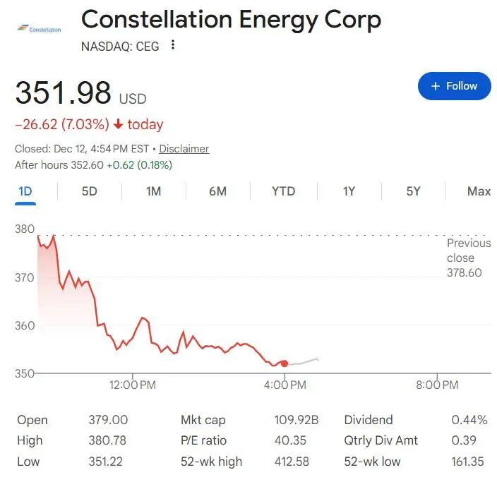 抛售潮甚至蔓延至能源板块,ConstellationEnergy、Vistra、GEVernova和Cummins等电力相关股票均跌。核电巨头Constellation收跌7%。