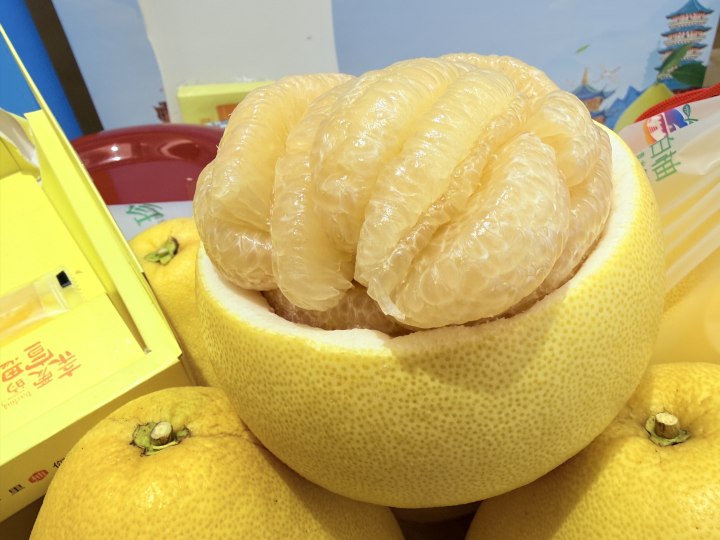 记者注意到,除了柚子产业推介外,现场还展示了“树上熟”精品果及其延伸品柚子汁、柚子糖、柚子酒、柚子蜜、柚子酥、柚子茶、柚子文创等10余种新品。现场还搭建了几个直播间,柚农们与时俱进,学习电商直播,只为将柚子卖得更多、销得更远。