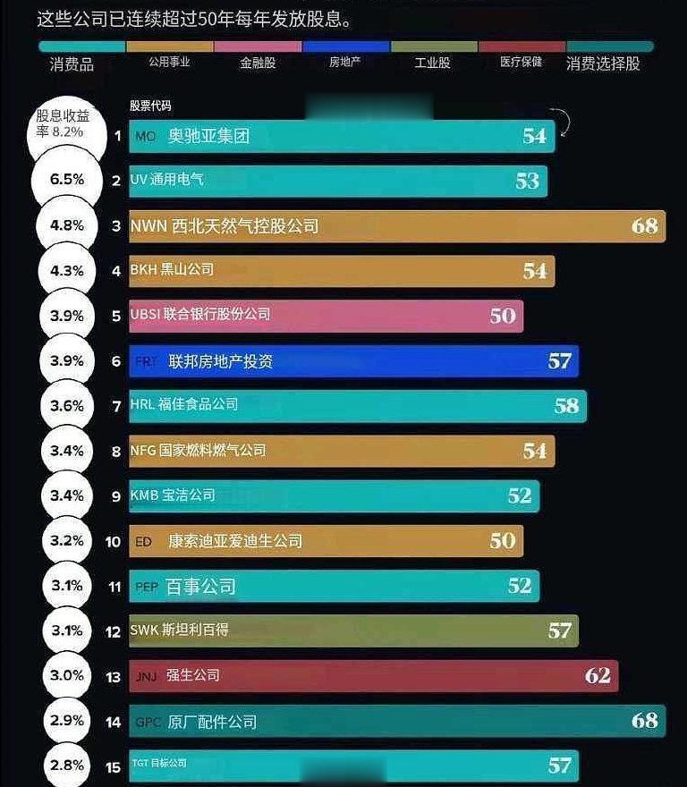 市场中那些另类:自1890年成立以来,宝洁一直连续133年支付股息。自1956年以来,连续67年增加了股息。在过去的十年中,股息以每年平均5%增长。TheYorkWater更牛,连续支付208年的股息了。而类似50年连续派发的股息公司就是一群了,当然派发股息是大股东获益最大,但这也说明公司持续向好,大股东只要搞好公司拿股息就很舒服了,和广大持股者利益一致。