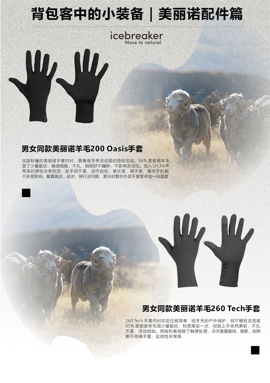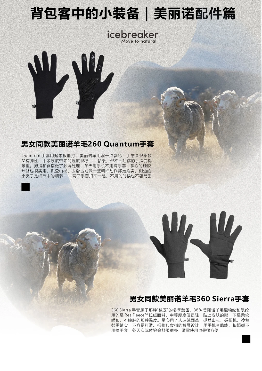 手套和围脖的重要就不用多说了,icebreaker的手套下面直接给你们总结出来。围脖和手套很适合登山、徒步、跑步、骑行和滑雪等运动,手套做滑雪手部保暖内层的时候很适配