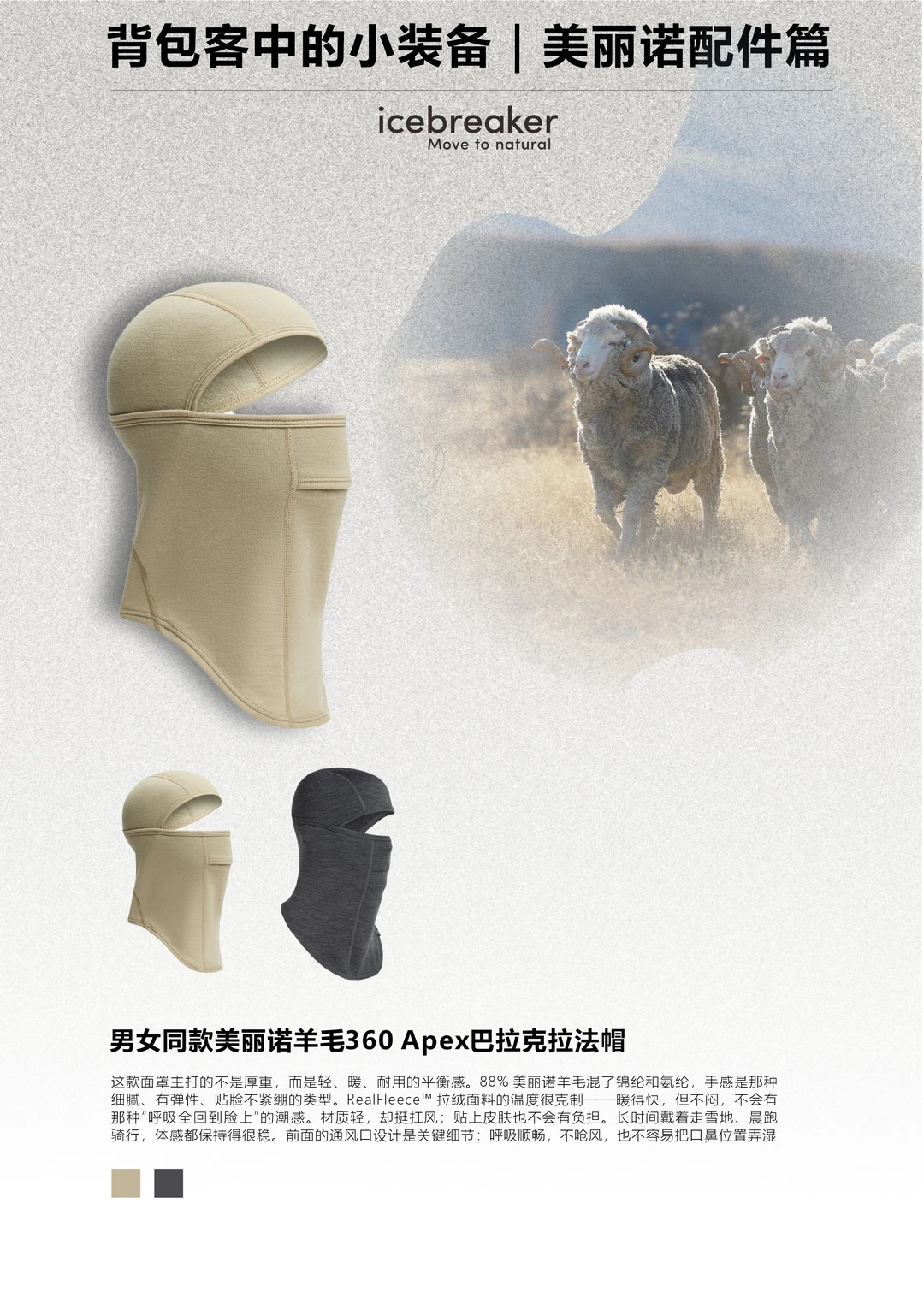 另一个🎿滑雪、雪山登顶必备的装备我会投给巴拉克拉法帽,能起到保暖的作用,也能起到一定的防晒作用。ib的法帽有两个版本,分别是1️⃣360 Apex系列和2️⃣200 Oasis系列