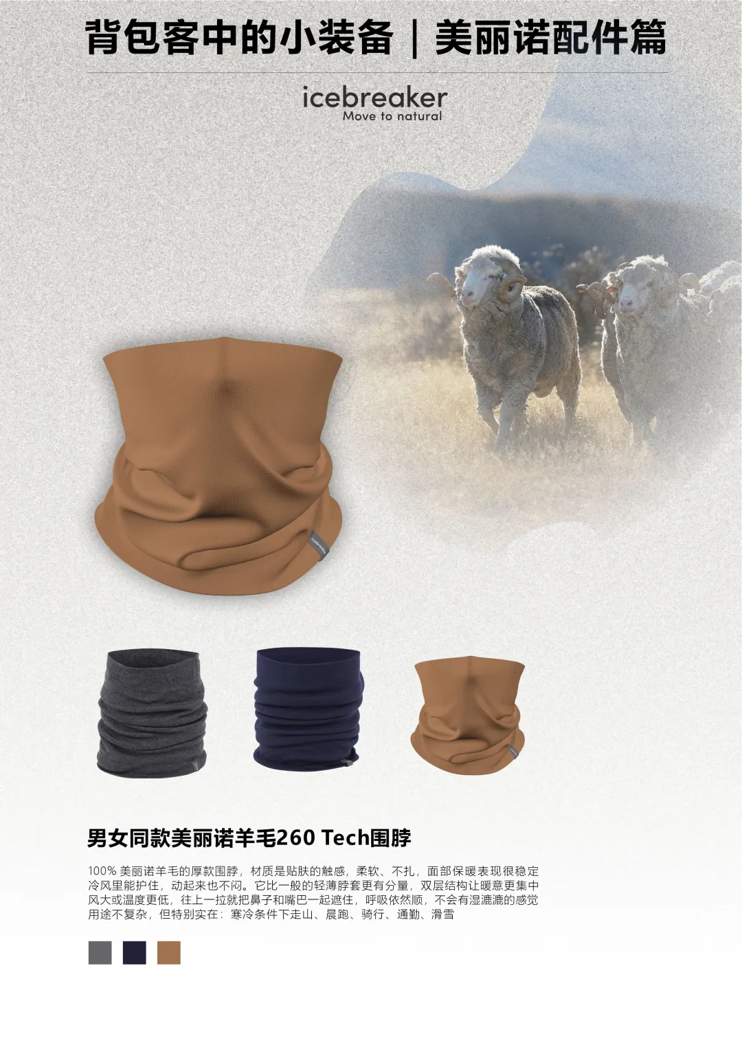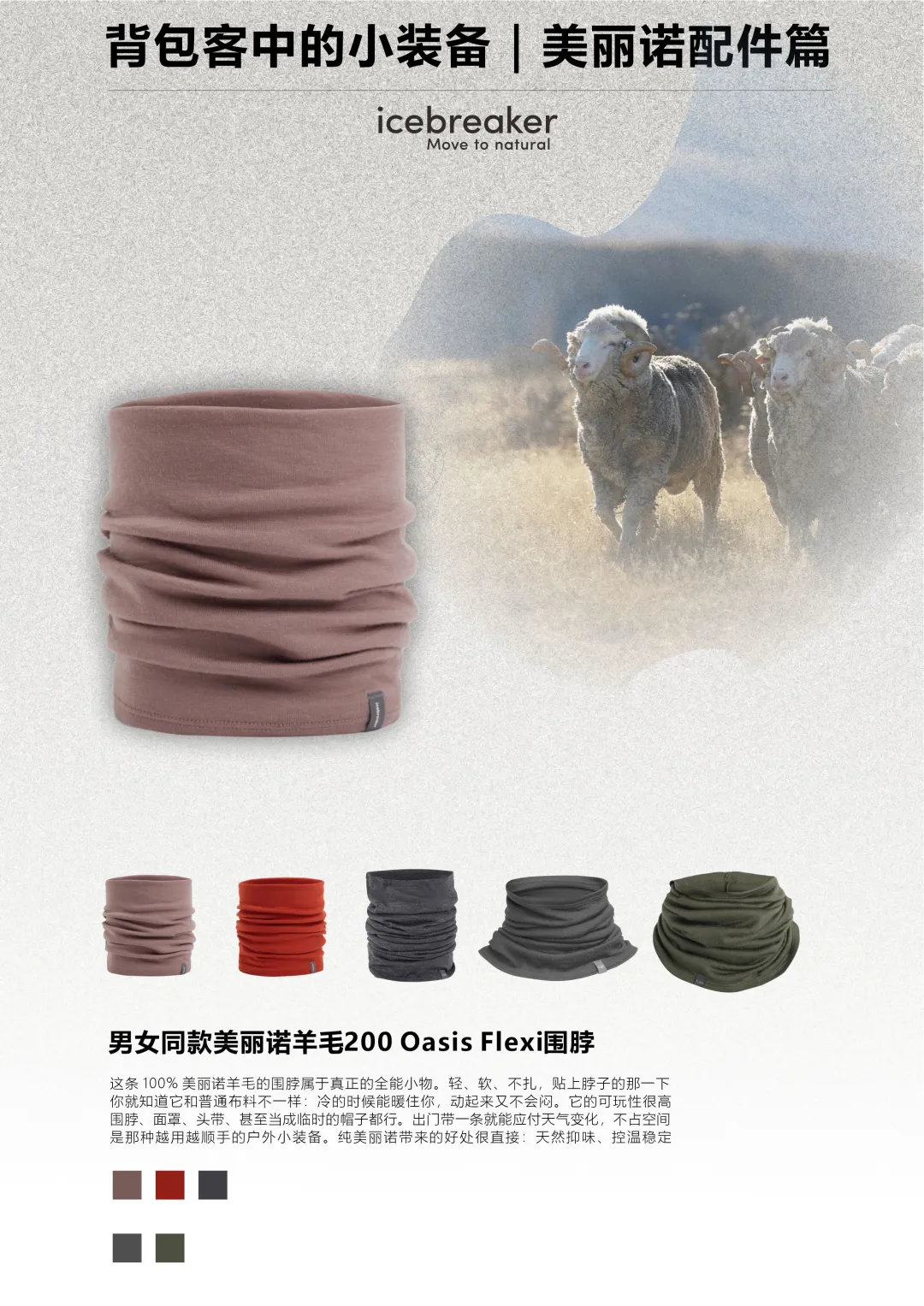 围脖只有两款,200 Oasis是多功能的轻量产品,纯美丽诺羊毛材质,可以用来当帽子、头带、面罩或遮阳帕。260 Tech的围脖就比较厚一点,注重保暖,也是纯羊毛