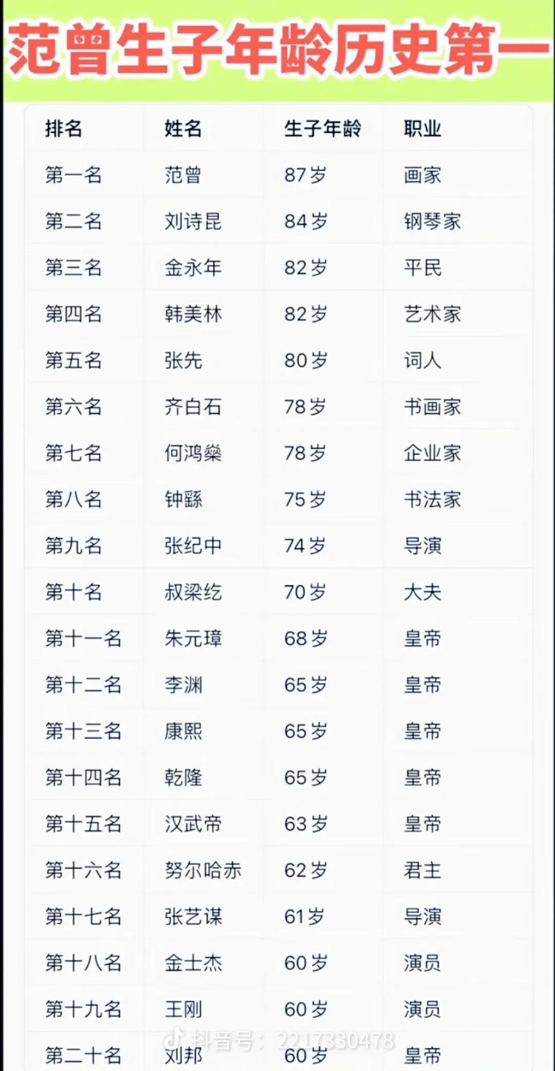 热烈祝贺:范曾先生荣获老来得子荣誉榜第一名 范曾先生今年已经87岁高龄了,他前后共有四位妻子,前不久他与年龄相差50岁的妻子喜得贵子,来自各界的祝贺声不断,他同时荣获中国历史上老来得子最高年龄排行榜第一名。我们在此谨向他的老当益壮,不减当年,雄风依旧的精神点赞。希望范曾先生再接再厉,在各方面再铸辉煌,再创佳绩。