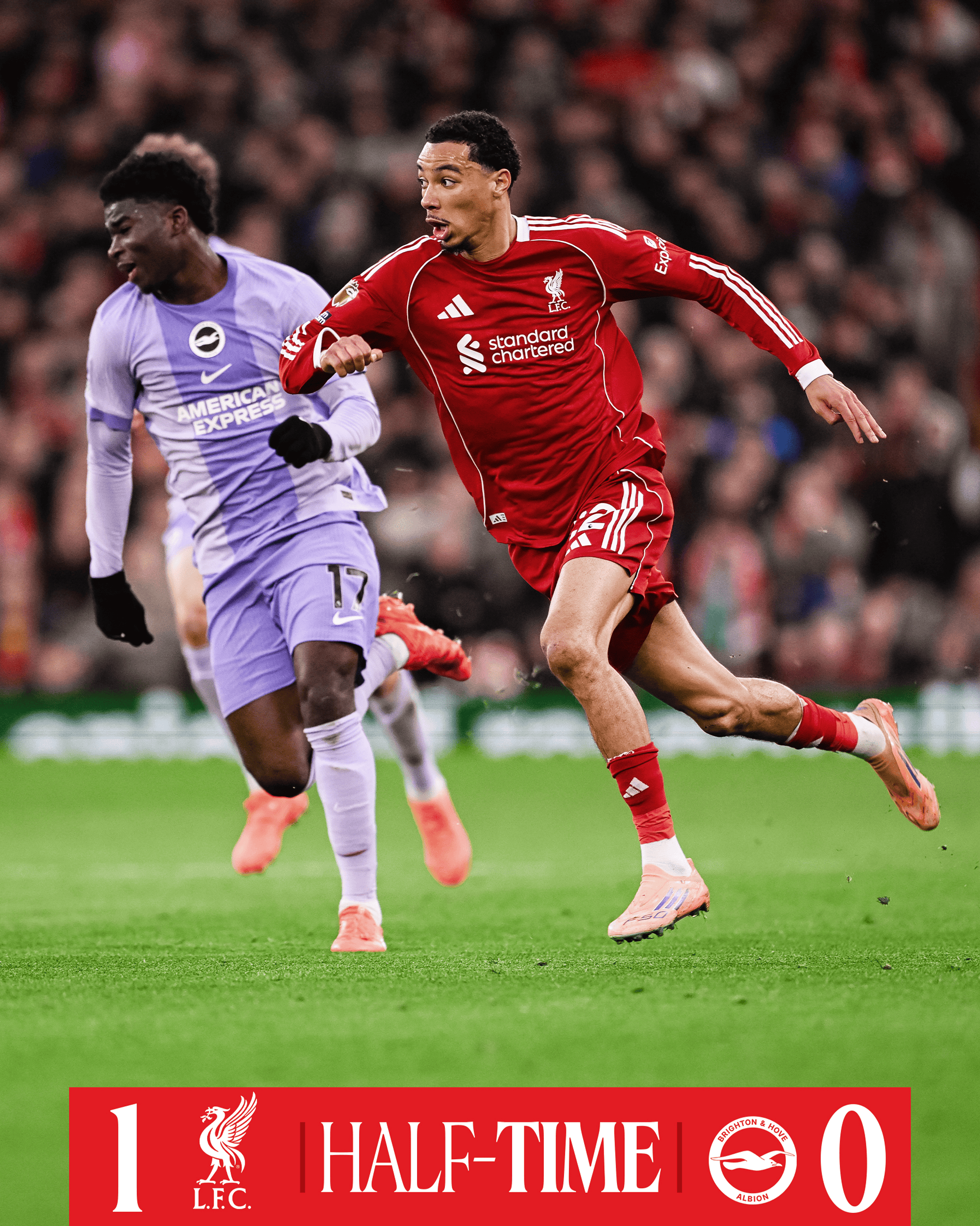 虎扑12月13日讯英超第16轮,利物浦主场迎战布莱顿。上半场比赛结束,利物浦1-0领先。