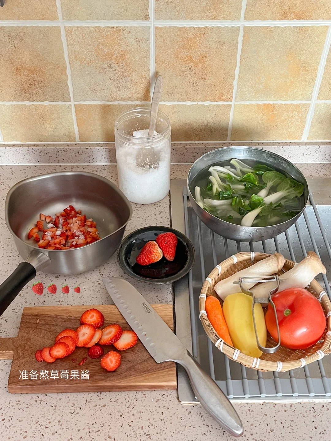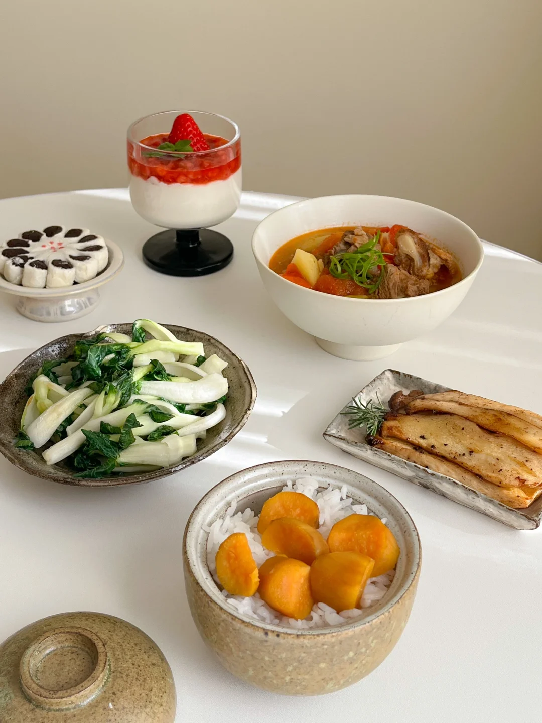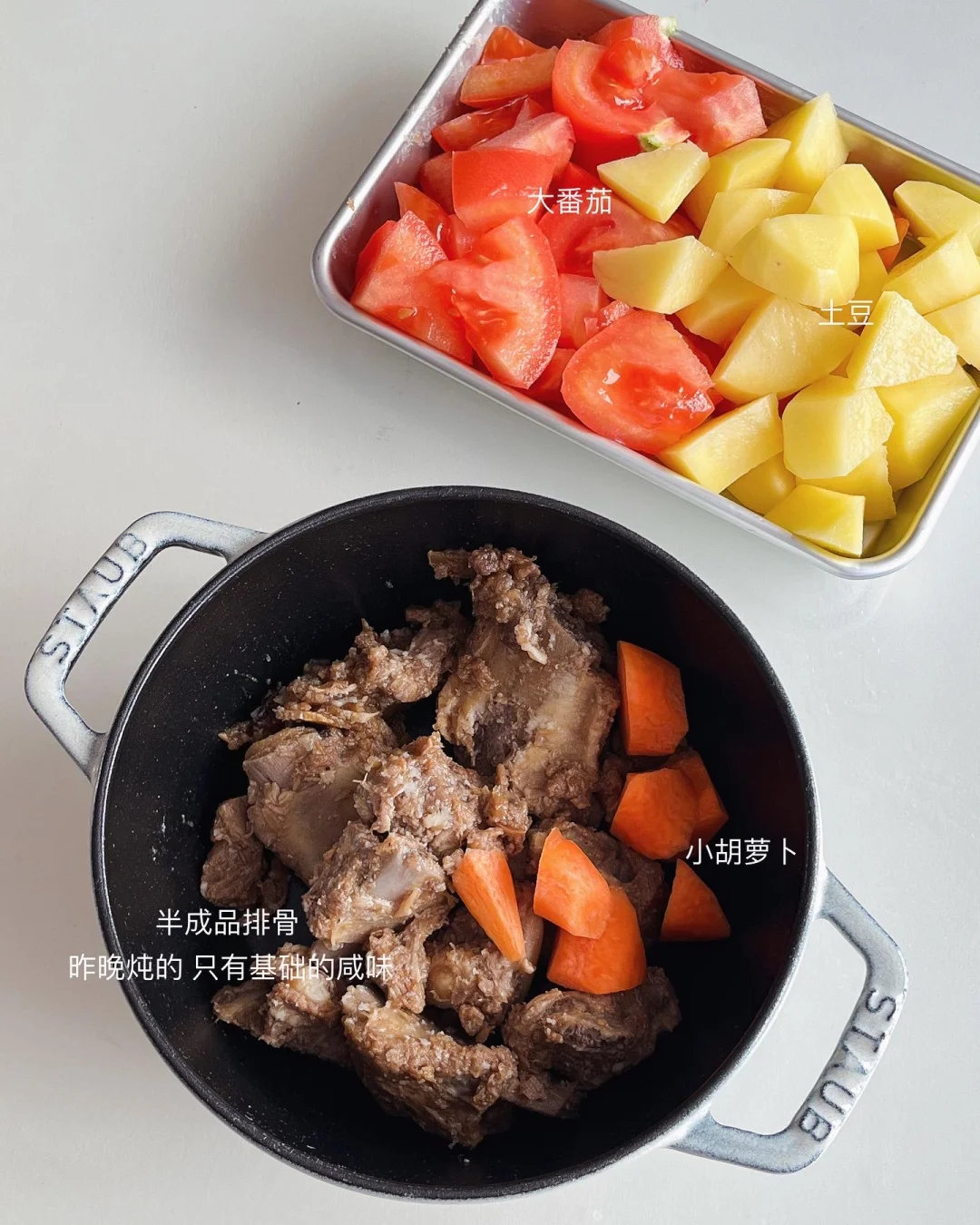 今天的饭: 番茄土豆烧排骨🍖 黄油煎蘑菇🧈 清炒奶白菜 红薯米饭 草莓布丁🍮 黄油煎蘑菇🧈 就一个字:香! 两个字:奶香! 要等黄油充分融化再放蘑菇片 再给点粗粒的海盐黑胡椒 比肉都好吃 草莓布丁🍮 提前一夜做好奶冻 铺满一层草莓酱 冰冰凉凉的 吃到开心啊🥳 番茄土豆烧排骨🍖 每次多烧点排骨 就基础的咸味 分装成几个盒子 想吃糖醋或者番茄汤口味 下班回来再加工下 20分钟就能吃到 ~