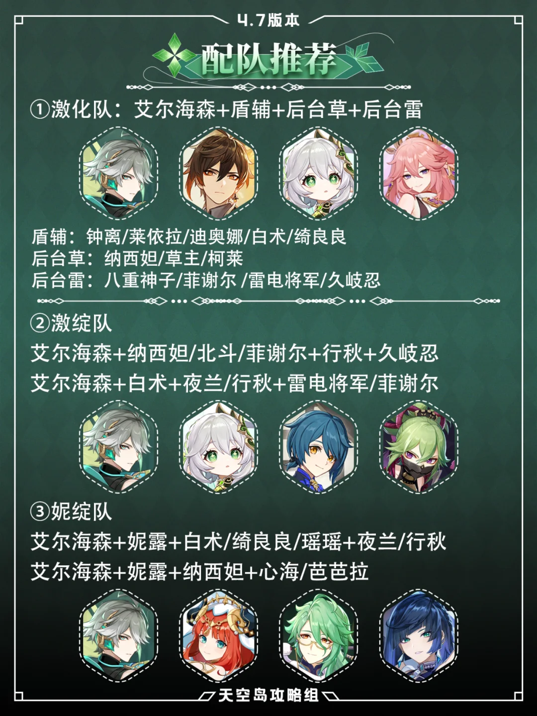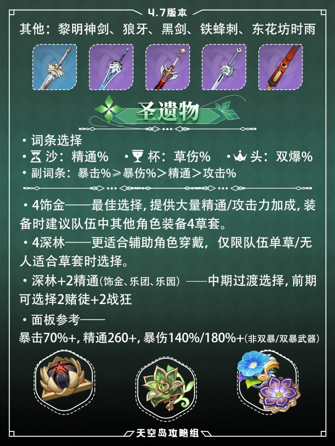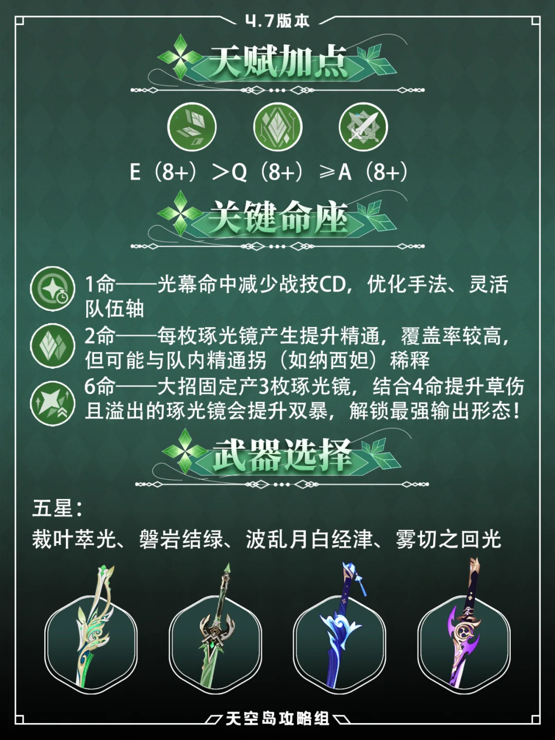 艾尔海森的全新攻略!请看这里![赞R] 1⃣天赋EQA都比较重要 2⃣武器选择:除专武外,五星可选:磐岩结绿、波乱、雾切 四星:黑剑、龙牙、铁锋刺、活动赠送东花坊时雨 三星黎明神剑也不错哦! 3⃣圣遗物优先选4饰金:精通沙、草伤杯、双爆头 4⃣配队:激化队、激绽队、妮绽队 队友可选纳西妲、八重神子、夜兰、行秋、久岐忍等 武器、组队、圣遗物等,你不会的看图就懂~