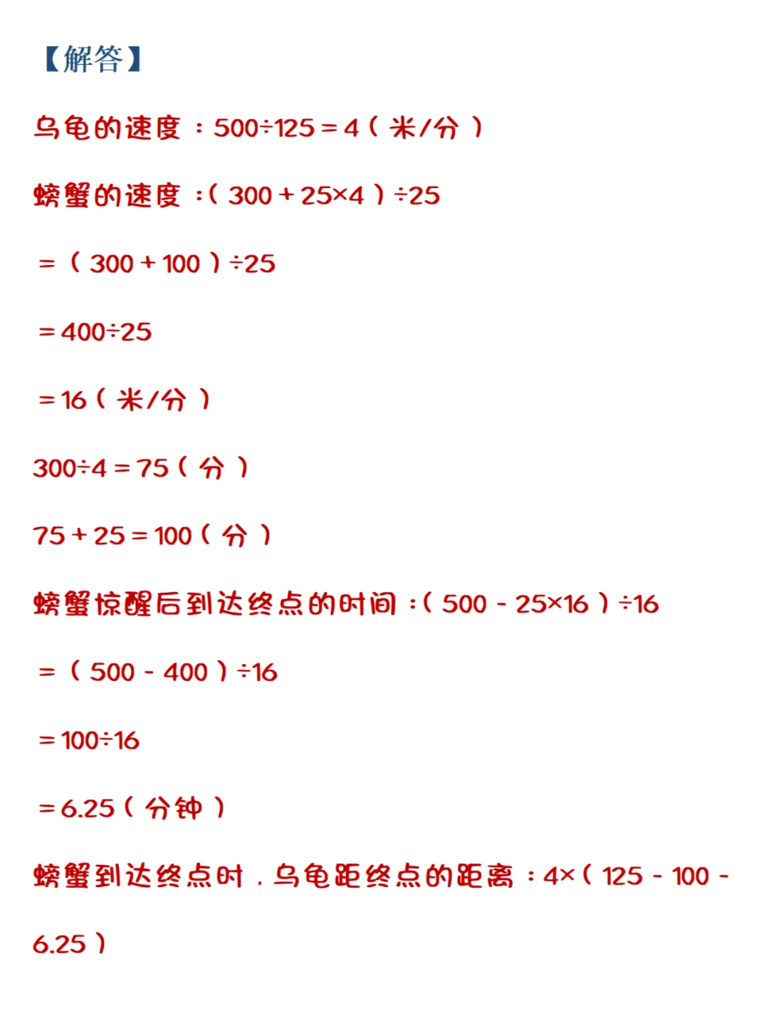 📚重庆小升初:“七龙珠”名校压轴真题练习💯 📍【思路点拨】 (1)根据速度=路程÷时间结合图像先算出乌龟的速度, (2)再根据“螃蟹出发25分钟后的路程-乌龟的路程=300”求出螃蟹的速度。 (3)进而求出乌龟和螃蟹的会合地离起点的时间,结合总路程和二者的速度解答即可。