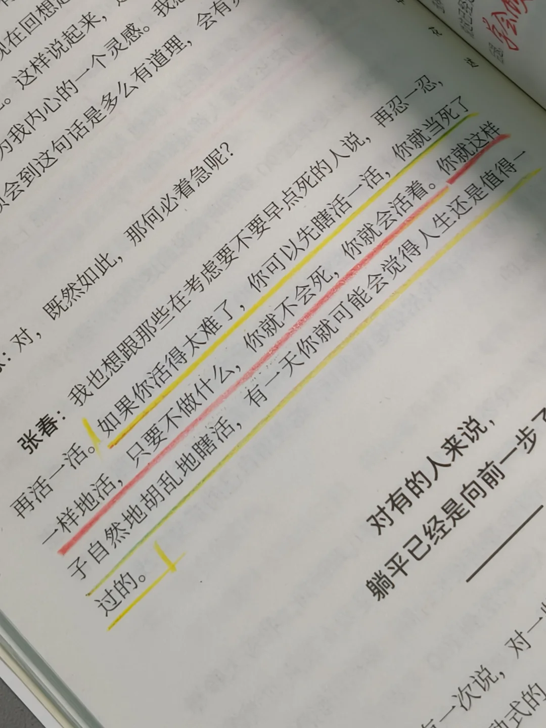 “如果你活得太难了,你可以先瞎活一活,你就当死了一样地活,只要不做什么,你就不会死,你就会活着。你就这样子自然地胡乱地瞎活,有一天你就可能会觉得人生还是值得一过的。”