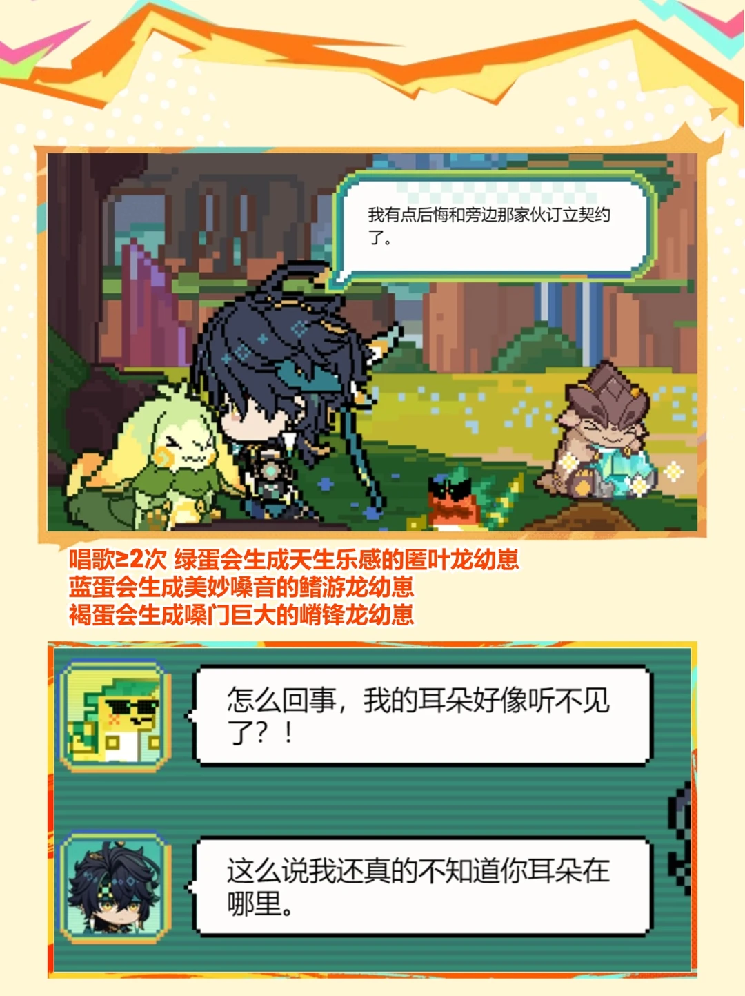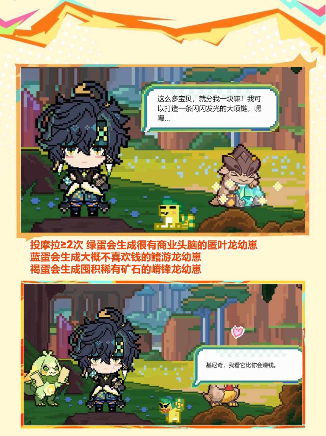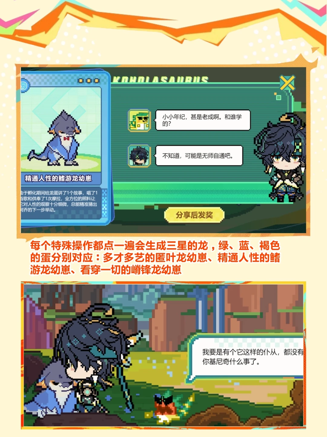 基尼奇H5「龙蛋奇遇记」已开启!可得40原石! 注意:⚡想要生成特殊的龙,只需要三个特殊操作都点一遍,或者其中一个特殊操作重复两次以上! ⚠️来历不明的蛋或者最小的蛋,那无论接下来怎么操作都只能生成鸽子和鳄鱼