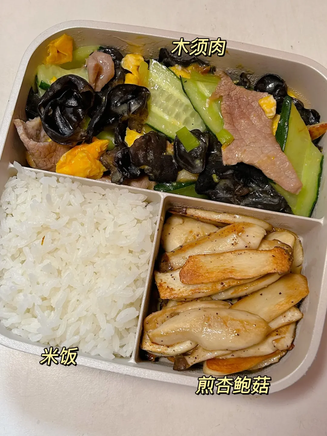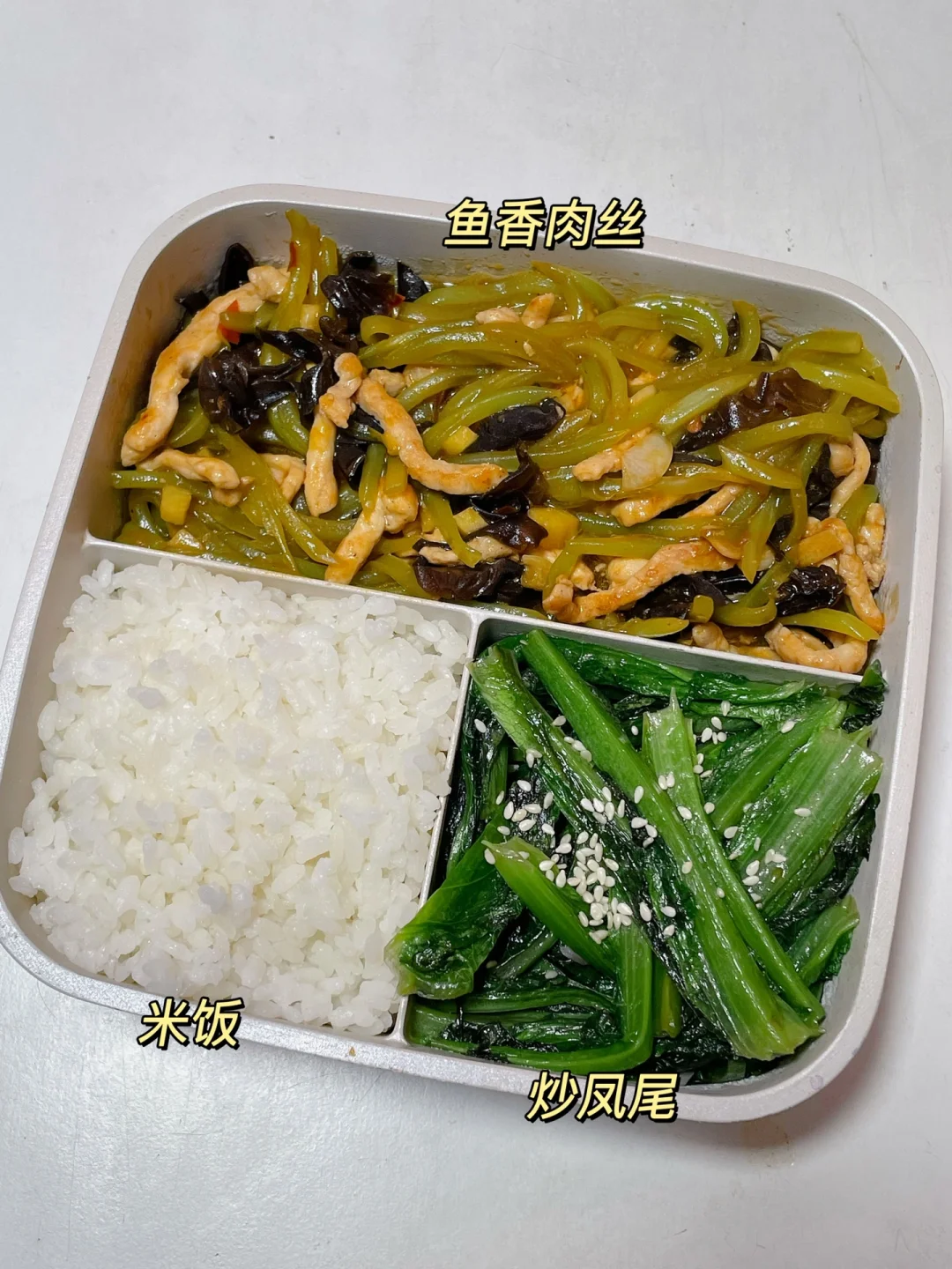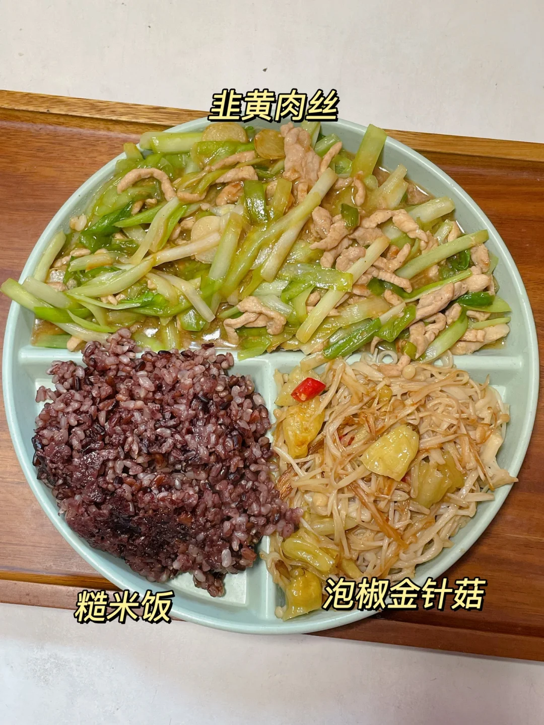 📍糙米饭+韭黄肉丝+泡椒金针菇