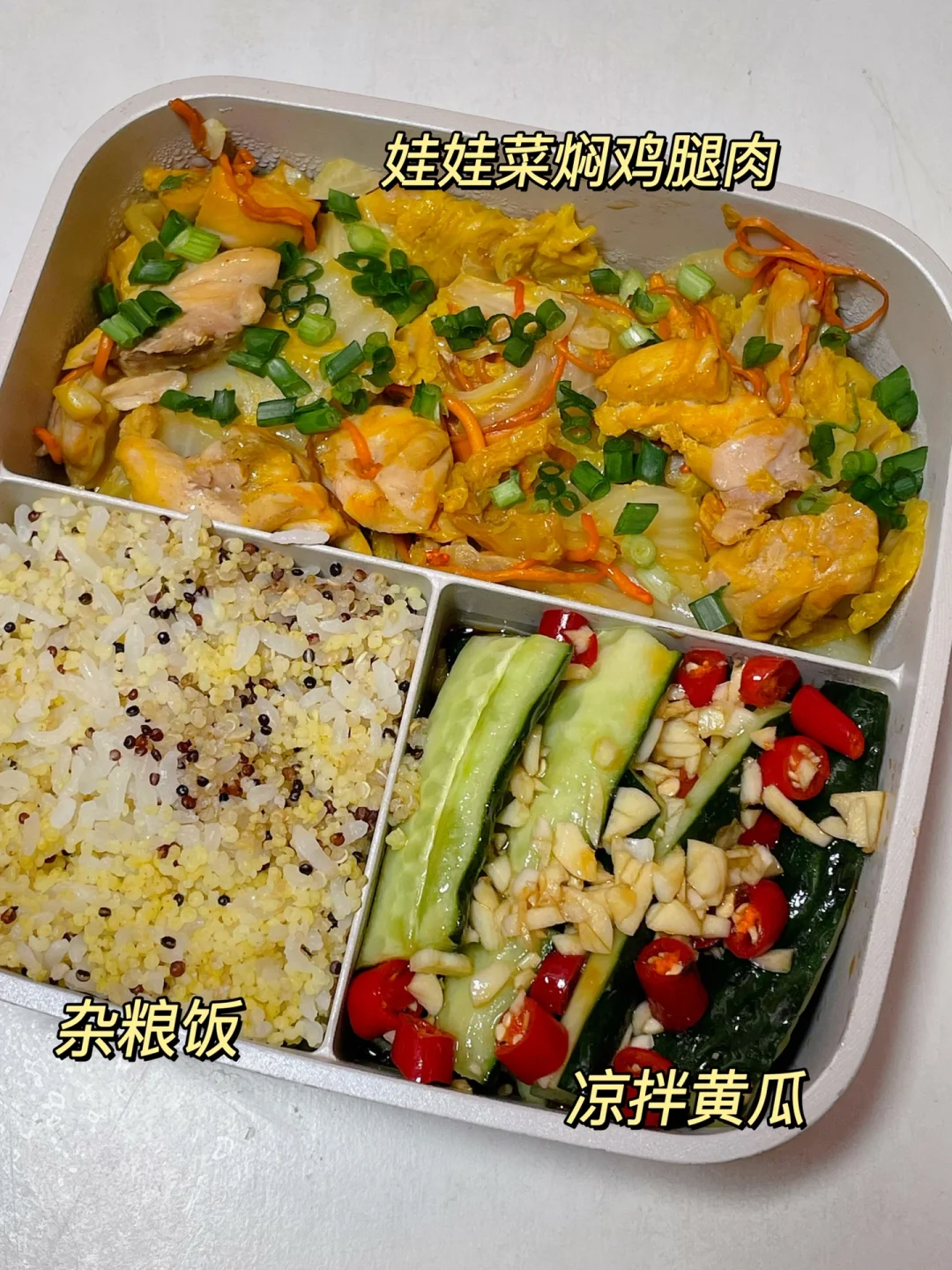 📍杂粮饭+娃娃菜焖鸡腿肉+凉拌黄瓜