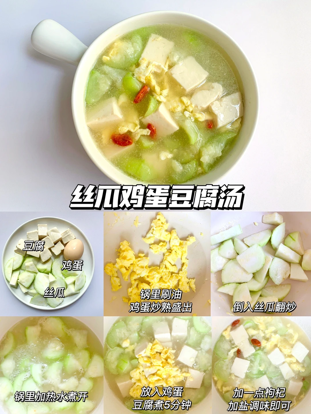 1⃣️锅里刷油,鸡蛋炒熟盛出,倒入丝瓜翻炒,加入水煮开,放入鸡蛋和豆腐煮5分钟,加一点枸杞和盐调味即可