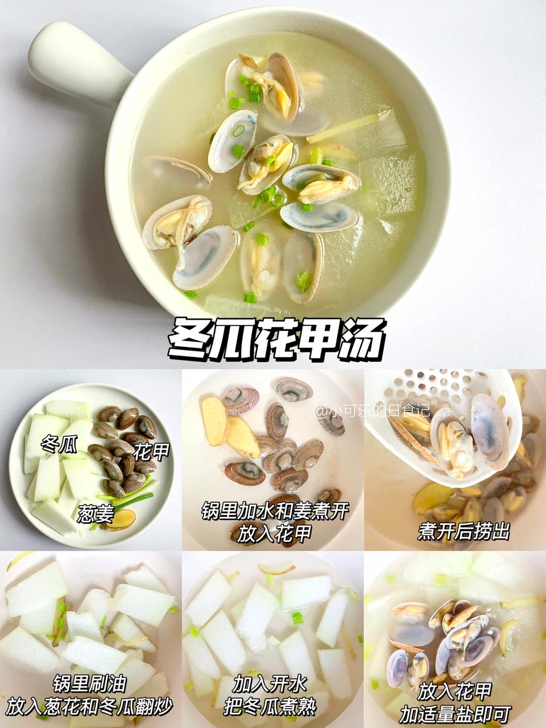 1⃣️锅里加水和姜煮开,放入花甲煮开捞出,锅里刷油,放入葱花和冬瓜翻炒,加入开水把冬瓜煮熟,放入花甲加点盐调味即可