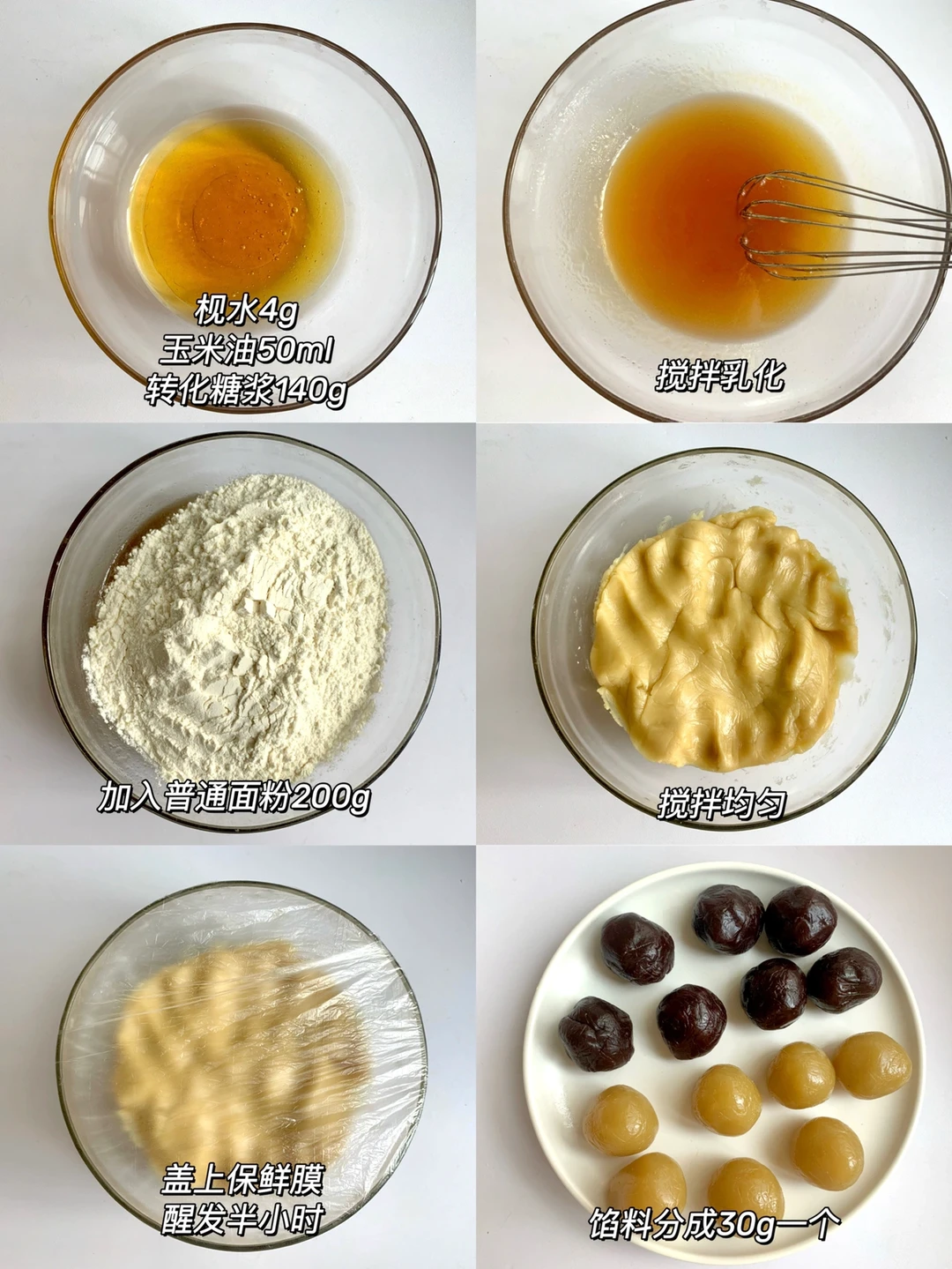 饼皮部分:面粉200克、糖浆140克、玉米油50克、枧水4克