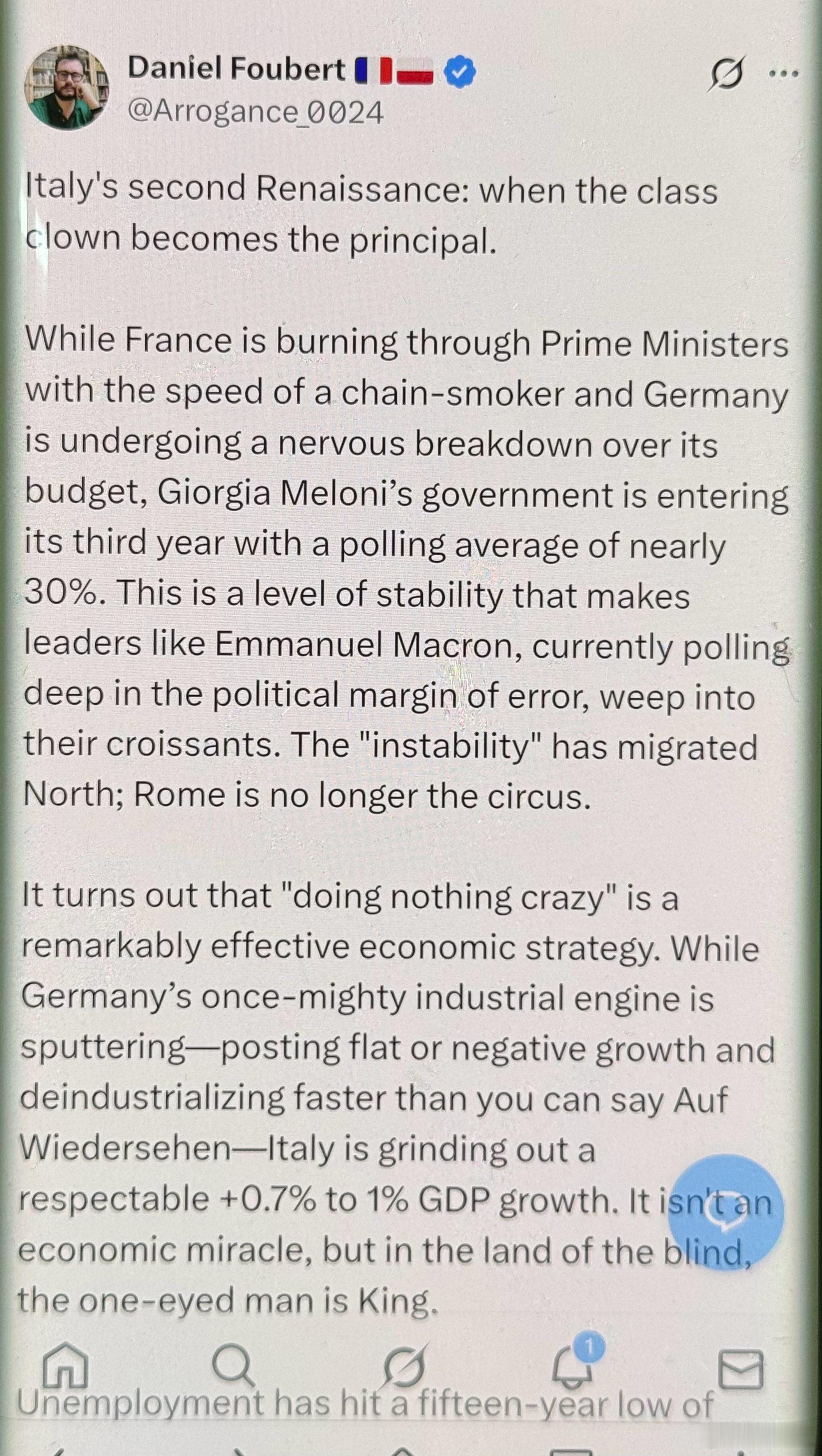 意大利的第二次文艺复兴:昔日“班级小丑”今成“校长”当法国换总理的速度堪比老烟枪抽完一支烟,德国为财政预算愁得焦头烂额时,乔治娅·梅洛尼领导的政府已执政近三年,支持率均值仍高达30%。这样的稳定度,足以让埃马纽埃尔·马克龙这类支持率跌至政治误差边缘的领导人,对着可颂暗自垂泪。如今“不稳定”已向北迁移,罗马不再是当年那个“混乱马戏团”。事实证明,“不瞎折腾”竟是一套异常有效的经济策略。德国曾不可一世的工业引擎如今步履蹒跚——经济增长停滞甚至负增长,去工业化速度快得让你来不及说出“再见”(Auf Wiedersehen);而意大利却稳步实现了0.7%至1%的可观GDP增长。这虽算不上经济奇迹,但正如“山中无老虎,猴子称大王”,在当下的欧洲语境中,这样的表现已足够亮眼。意大利失业率降至6.2%,创下15年新低;而令人担忧的德意两国国债收益率“利差”,也收窄到了近乎“乏味”的水平。意大利正悄然证明:运营一个G7经济体,无需因一时的“道德恐慌”关停核电站,也不必自欺欺人地假装债务不存在。然而,这种“新现实主义”最显著的证据,藏在“-62%”这个数字里——这是2024-2025年期间,意大利非法海上入境人数较往年的降幅。当欧洲其他国家还在为移民问题起草“措辞强硬的文件”时,罗马政府直接向北非伙伴开出支票,并在阿尔巴尼亚设立了处理中心。这是一套冷酷的实用主义策略:将边境管控“外包”,以确保本土秩序。意大利正向西方表明:前路不在宏大的乌托邦式联邦梦想中,而在国家层面的现实主义里。通过将亲北约的外交政策、严格的边境管控,以及“不惊吓市场”的财政预算相结合,意大利已然勾勒出一套生存蓝图。西欧的重建正在发生,颇具讽刺意味的是,引领这一进程的,竟是那个曾被所有人认定“忙着午睡,无心理政”的国家。
