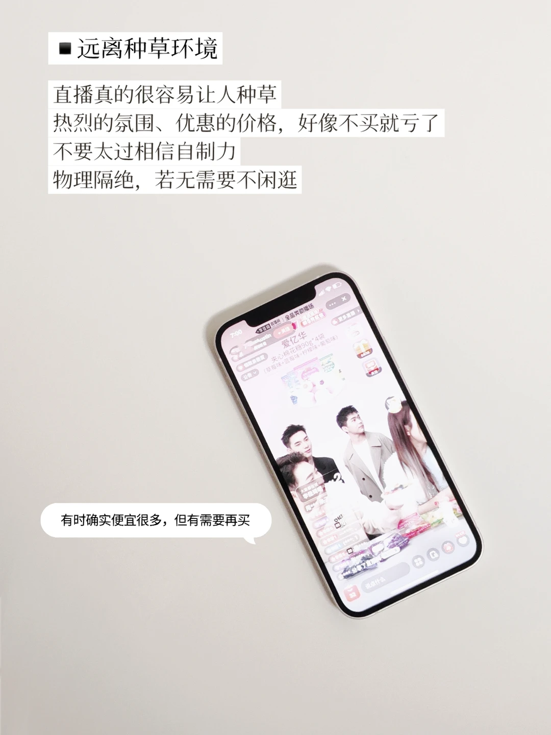 直播真的很容易让人种草,热烈的氛围、优惠的价格,好像不买就亏了,冲动之后就剩后悔。不要太过相信自制力,物理隔绝,无需要不闲逛