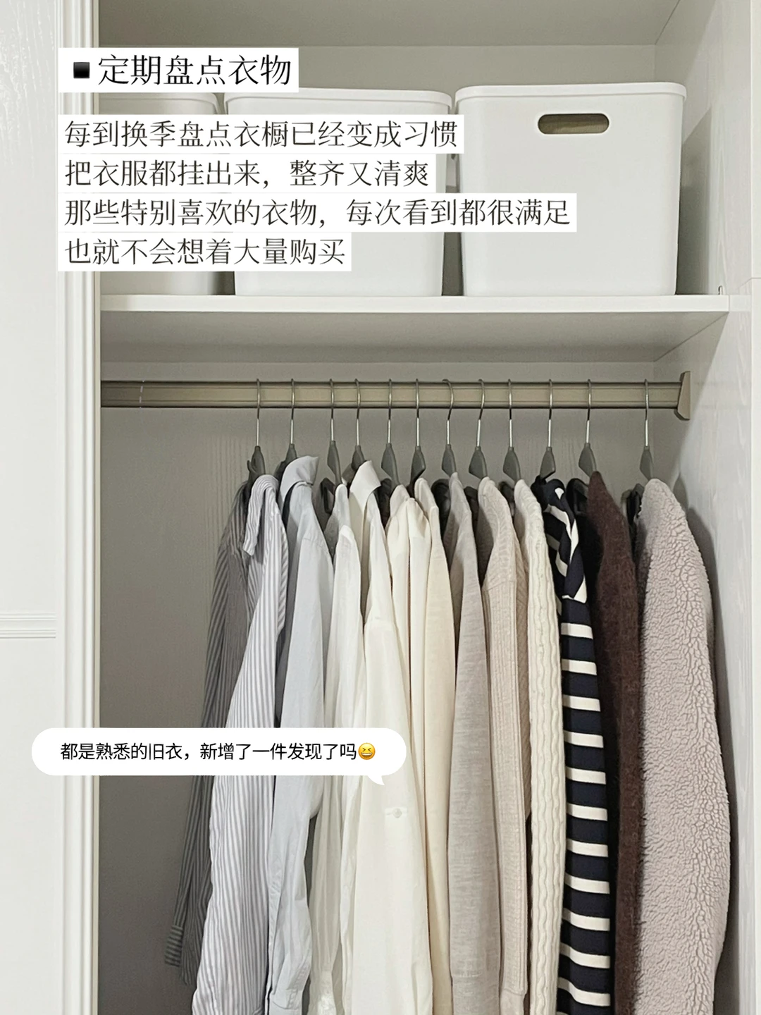 每到换季盘点衣橱已经变成习惯。把衣服都挂出来,整齐又清爽。衣柜里那些特别喜欢的衣物,每次看到都很满足,也就不会想着大量购买