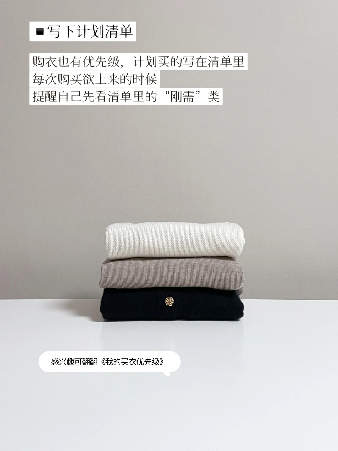 购衣也有优先级。计划买的写下来,每次购买欲上来的时候,提醒自己先看清单里的“刚需”类