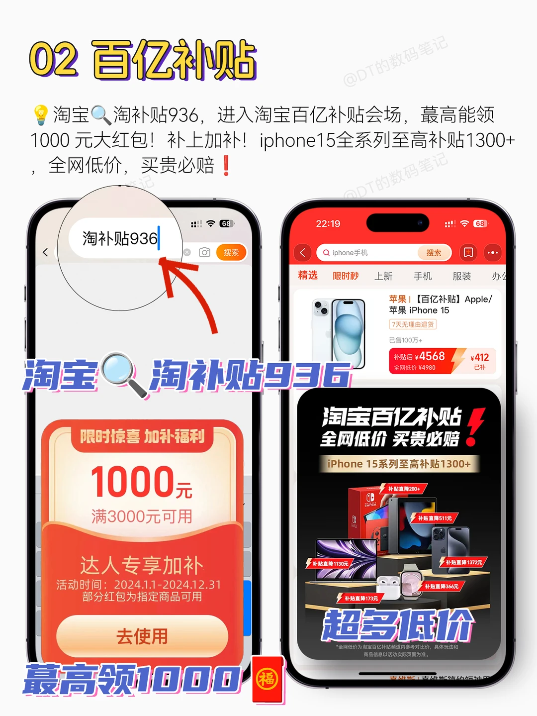 进入淘宝百亿补贴会场,蕞高能领 1000 元大红包!补上加补!iphone15全系列至高补贴1300+,全网低价,买贵必赔‼️