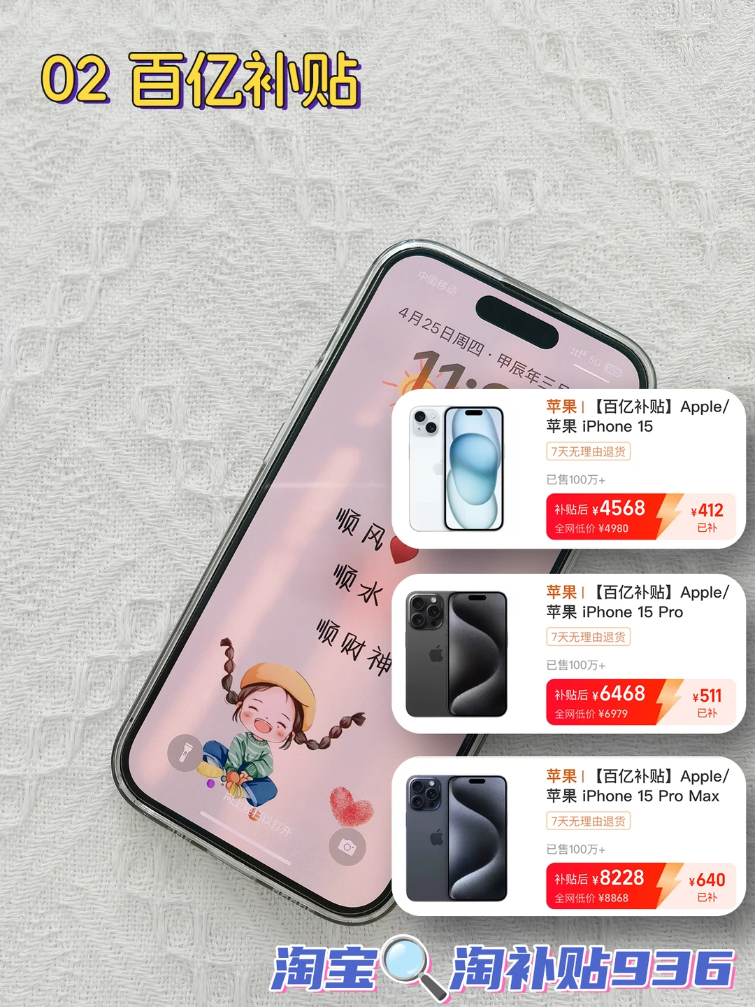 蹲蹲党们有福了[偷笑R]现在淘宝百亿补贴iPhone15最低只要4568元,比官网的5999便宜1431元,价格力直接拉满!不需要等到618就能买到心仪的好价iPhone!!!