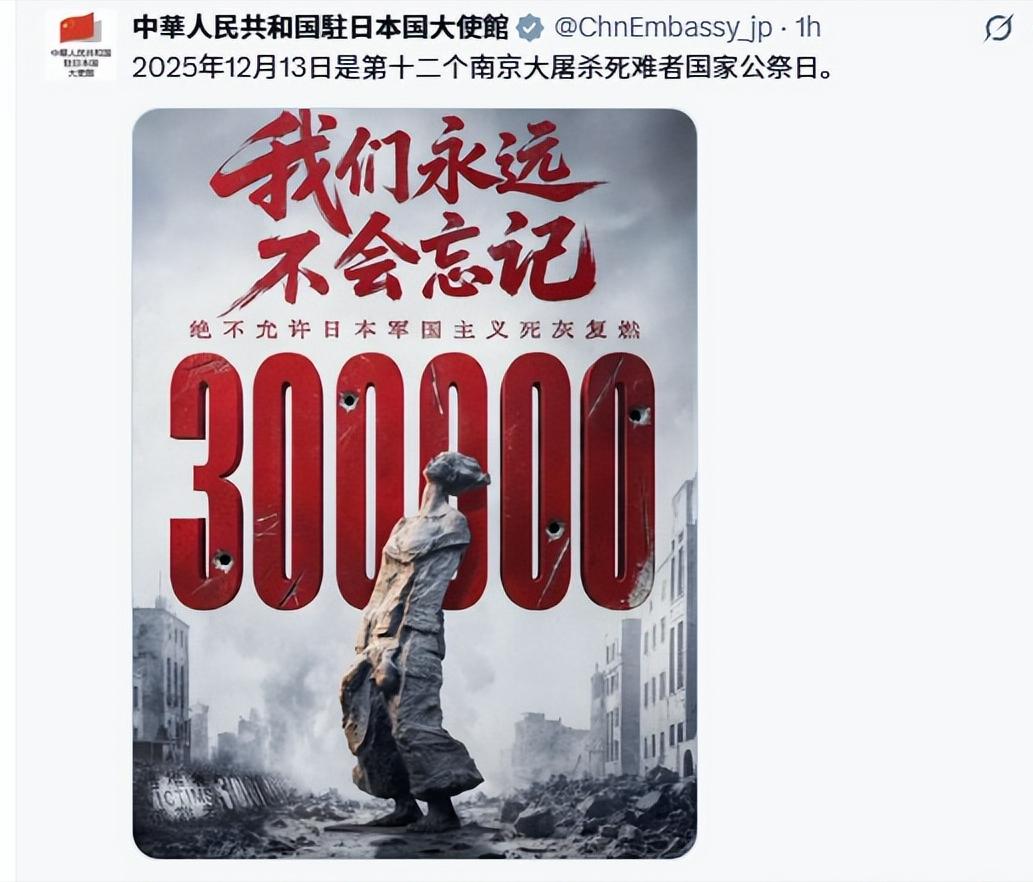 这次我们一个日本字都没写! 中国驻日大使馆12月13日发文写道:2025年12月13日是第十二个南京大屠杀死难者国家公祭日,并附图,图中,巨大的红色 “300000” 字样让人醒目,一位衣衫褴褛、身形佝偻的受难者形象立在下面,当时的绝望和苦难是我们现代人无法想象的。 很多人可能会问,驻日大使馆发文,怎么连一个日本字都不提?其实这恰恰是最有力的表达 —— 历史真相从来不需要用对方的语言去辩解,也不需要多余的修饰,这串红色数字和受难者的身影,就是跨越语言的铁证,是刻在民族骨血里的记忆。 1937 年 12 月 13 日,日军攻破南京,接下来的四十多天里,这座古都变成了人间地狱,集体射杀、活埋、刀劈,日军的暴行罄竹难书。 战后南京审判战犯军事法庭早已给出铁证,集体屠杀的 19 万余人,慈善机构收埋的 15 万余具零散尸体,加起来超过 30 万条生命,这不是冰冷的数字,是 30 万个父亲、母亲、孩子,是 30 万个破碎的家庭。 不写日本字,是因为有些账,无需多言,对方本该心知肚明。这些年,日本右翼势力一直在做什么?他们篡改教科书,把 “侵略” 改成 “进出”,把大屠杀说成 “虚构”,甚至有政客公然宣称南京大屠杀是编造的。 他们销毁档案、否认证词,用尽手段想抹去这段血史,但事实哪能这么容易被篡改?当年参与屠杀的日军官兵日记里,明明白白写着 “全部彻底消灭” 的屠杀方针; 国际法庭上,10 多位中外证人的证词、100 多份书面材料,都钉死了日军的罪行;联合国教科文组织也早已将《南京大屠杀档案》列入世界记忆名录,这是全人类公认的历史真相。 驻日大使馆的这份发文,是给我们自己的警醒,也是给世界的宣告。一字不提日本,不是懦弱,是底气 —— 我们不需要靠指责来证明什么,历史就在那里,铁证如山。那个衣衫褴褛的受难者形象,让我们看到的不只是苦难,还有当年国人在绝境中的挣扎。 想想那个年代,没有先进的武器,没有坚固的防线,普通百姓只能在日军的屠刀下任人宰割,他们的绝望,是我们现在坐在温暖的屋子里,看着安稳的生活无法体会的。我们铭记这段历史,不是为了延续仇恨,是为了不让这样的悲剧再发生。 从 2014 年国家设立公祭日开始,每年的这一天,南京城都会拉响防空警报,汽车、火车、轮船汽笛齐鸣,全城默哀。这十二年,我们一直在用自己的方式纪念死难者,传承历史记忆。 驻日大使馆的发文,没有激昂的口号,没有尖锐的谴责,却用最克制的方式传递了最坚定的立场 —— 历史不容篡改,先烈不容遗忘。 对于经历过战乱年代的人来说,这段历史可能更触目惊心,他们或许见过流离失所的难民,听过日军暴行的传闻,甚至有亲人在战乱中丧生,所以他们更明白和平有多珍贵,更清楚忘记历史意味着什么。 现在的年轻人可能对那段历史的感受没那么深刻,但这串 “300000” 的数字、那个受难者的形象,就是要提醒每一代人,我们脚下的土地,曾被鲜血浸染;我们现在的和平,是用先辈的生命换来的。 不写日本字,也是在告诉世界,我们纪念死难者,是为了守护和平,不是为了挑起冲突。就像那些坚持真相的日本友人,他们顶着右翼压力,搜集证据、研究历史,只为还历史一个公道,这说明正义和良知不分国界。 今天,我们看着这张图片,心里五味杂陈,有悲痛,有愤怒,更有坚定。悲痛的是 30 万同胞惨遭屠戮,愤怒的是有人至今不愿承认历史,坚定的是我们一定会守护好这份记忆。 一个日本字都不写,因为真相无需赘述,立场无需妥协。我们铭记南京大屠杀,不是要恨谁,是要记住 “落后就要挨打” 的道理,是要珍惜现在的和平生活,是要让我们的国家更加强大,强大到再也没有人敢欺负我们。 第十二个国家公祭日,驻日大使馆的这份特殊发文,是最沉的历史告白。它告诉我们,无论过去多少年,这段血史都将刻在民族的记忆里;无论别人怎么否认,我们都将坚定地守护历史真相。 愿我们每个人都能记住那段苦难的历史,用我们的努力,让国家更富强,让和平更长久。