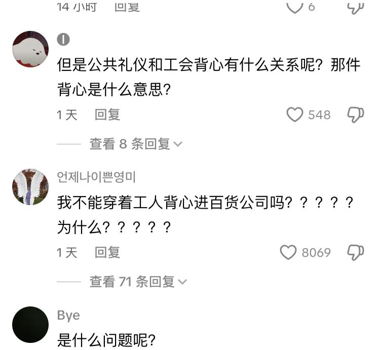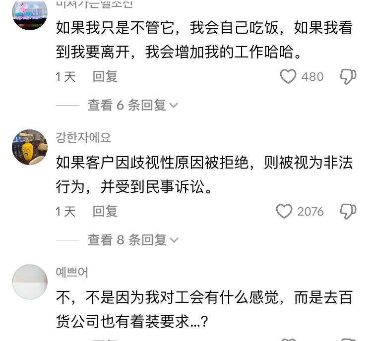韩国工人在商场普通餐厅吃饭被歧视,餐厅工作人员要求他脱掉工作服,认为在公共场合不应该穿工作服 工人大哥“打工人为什么要为难打工人,大家都一样” 工作人员回答“这是礼仪问题” 大哥“我去青瓦台也是这样穿,有什么问题” 韩网友纷纷批评餐厅歧视工人,又不是什么高档餐厅还管别人的穿着,真把自己当回事,如果穿拖鞋去吃饭是不是要报警