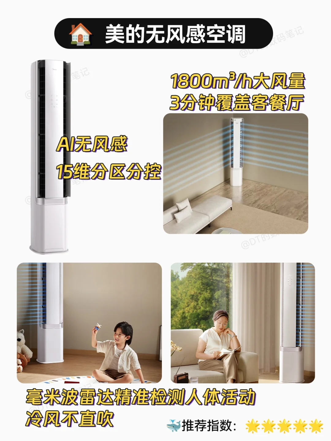 1800m³/h风量3分钟迅速将冷气、暖气覆盖客餐厅,同时采用AI无风感技术,利用毫米波雷达精准检测人体活动,实现冷风不直吹老人腿🧒小孩头,避免感冒着凉~还有15维分区分控系统,照顾家人不同需求🌬️想吹吹得到,想避避得开