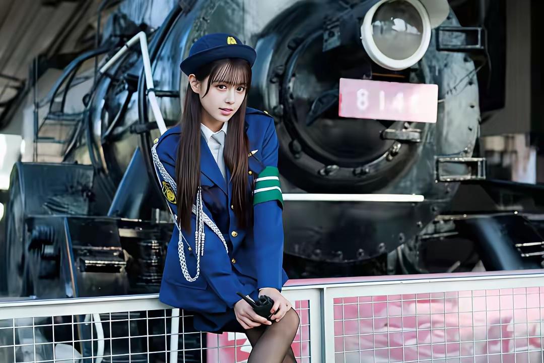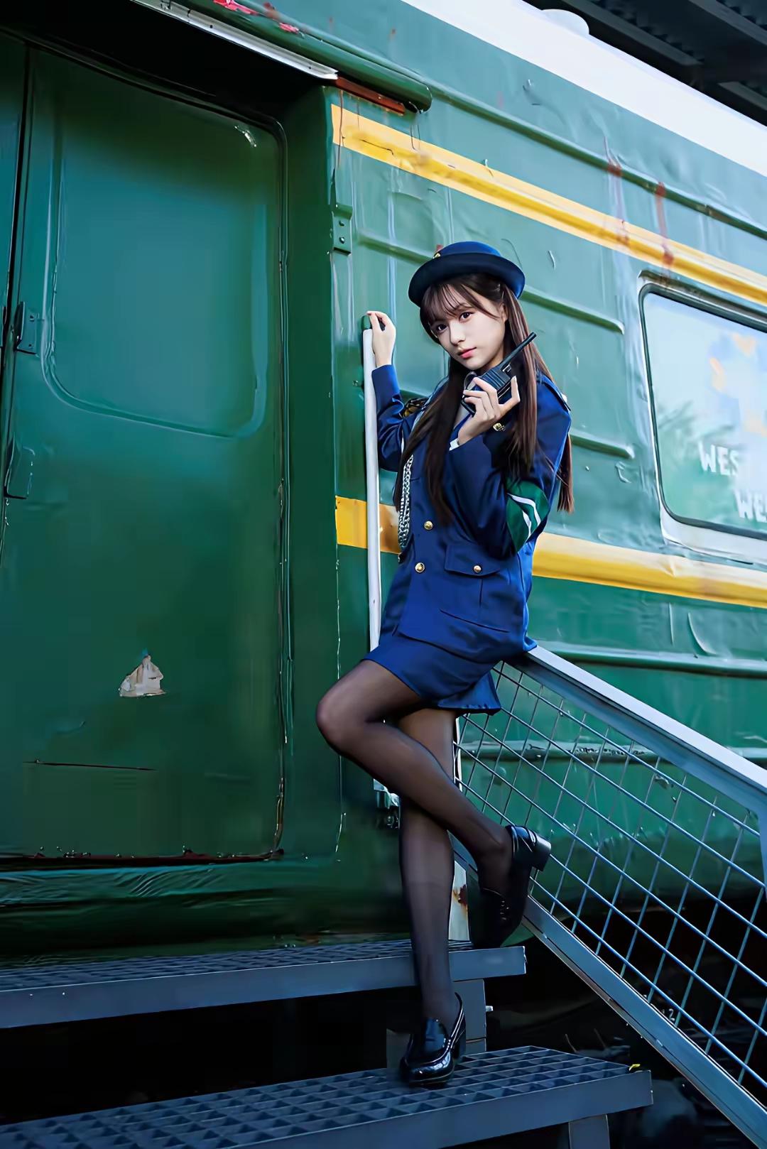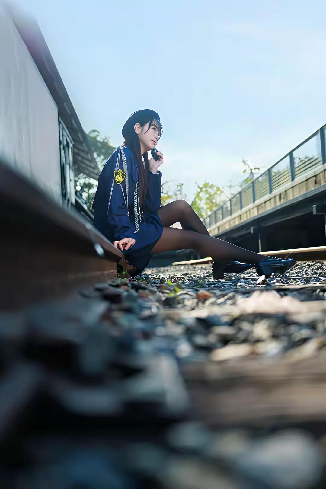 铁路边上的青春少女,蓝制服与黑丝袜的完美搭配,甜美又帅气!🚂💃🏻
