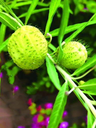 这种乍一看像一只生气的绿色河豚的果子叫钝钉头果,它还有一个听起来很文艺的名字——风船唐棉。它原产于非洲热带地区,现在在我国华南地区可露地栽培。北京的同学们,现在可以在北京国家植物园南园的温室一睹它的芳容。