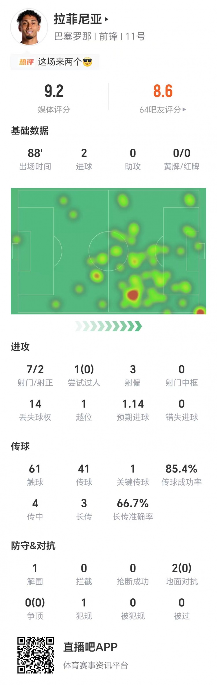 赛后技术统计数据显示,拉菲尼亚本场比赛7射两正,1次关键传球,获评9.2分。