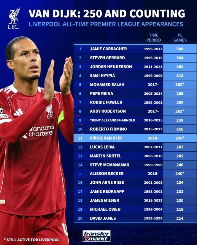 直播吧12月14日讯英超第16轮,利物浦在安菲尔德以2-0的比分战胜布莱顿。本场比赛,红军队长范戴克迎来代表球队的第150场英超出场,这让他足以位居队史第11位。