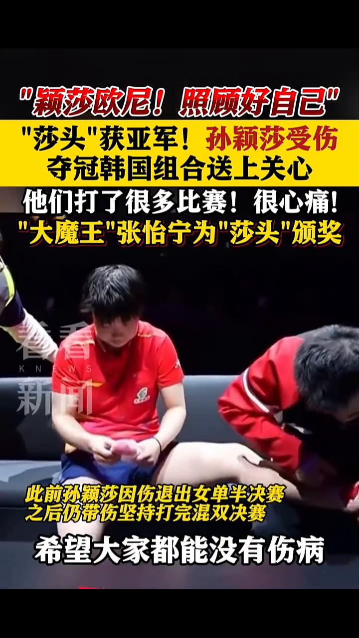 "莎头"获亚军!孙颖莎受伤,夺冠韩国组合送上关心。 看看新闻Knews。 12月13日,孙颖莎选手之前受了伤,赛后韩国选手对受伤的孙颖莎致以关心。此前孙颖莎因伤退出女单半决赛,之后仍带伤坚持打完混双决赛。希望大家都能没有伤病,能开心地进行竞争。