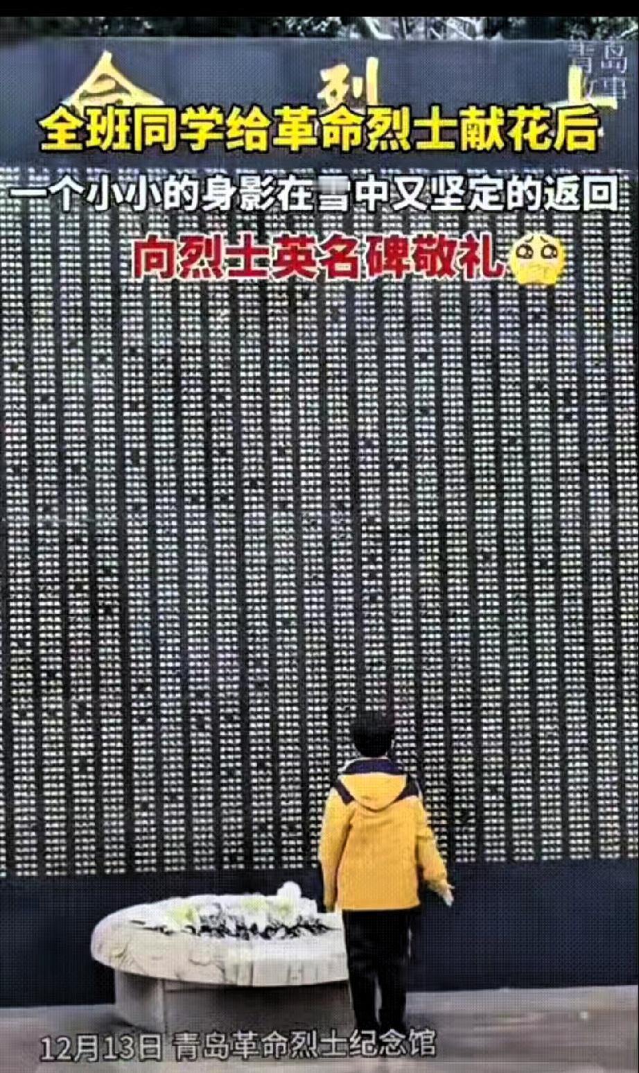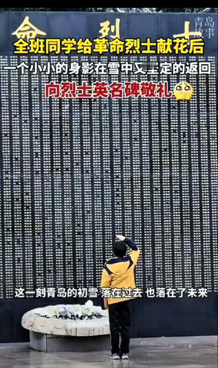 这一刻真的哭死!学校组织去青岛革命烈士纪念馆献花,仪式结束后同学们都跟着老师离场,只有他悄悄停下,转身往回走。 天上飘着细雪,他走得不快但很稳,一直走到烈士英名碑前才停下。小小的身子站得笔直,然后抬起手,认真敬了个礼。 有人说“像是战士回来了”,其实不用这么说——这只是孩子用自己的方式,表达对英烈的敬意。那些刻在碑上的名字,那些曾守护这片土地的人,他虽然年纪小,却真的记在了心里。 总有人担心现在的孩子不懂历史,可这个男孩的举动说明,红色的种子早就悄悄发了芽。红色教育从不是刻意的灌输,而是这样自然而然的敬畏,是仪式结束后,舍不得离开的那几步。 英烈们当年守护家园,为的就是让孩子们能平安长大。如今这个雪地里的敬礼,就是最好的回应:他们的付出,我们没有忘记;他们的精神,正在被好好传承。