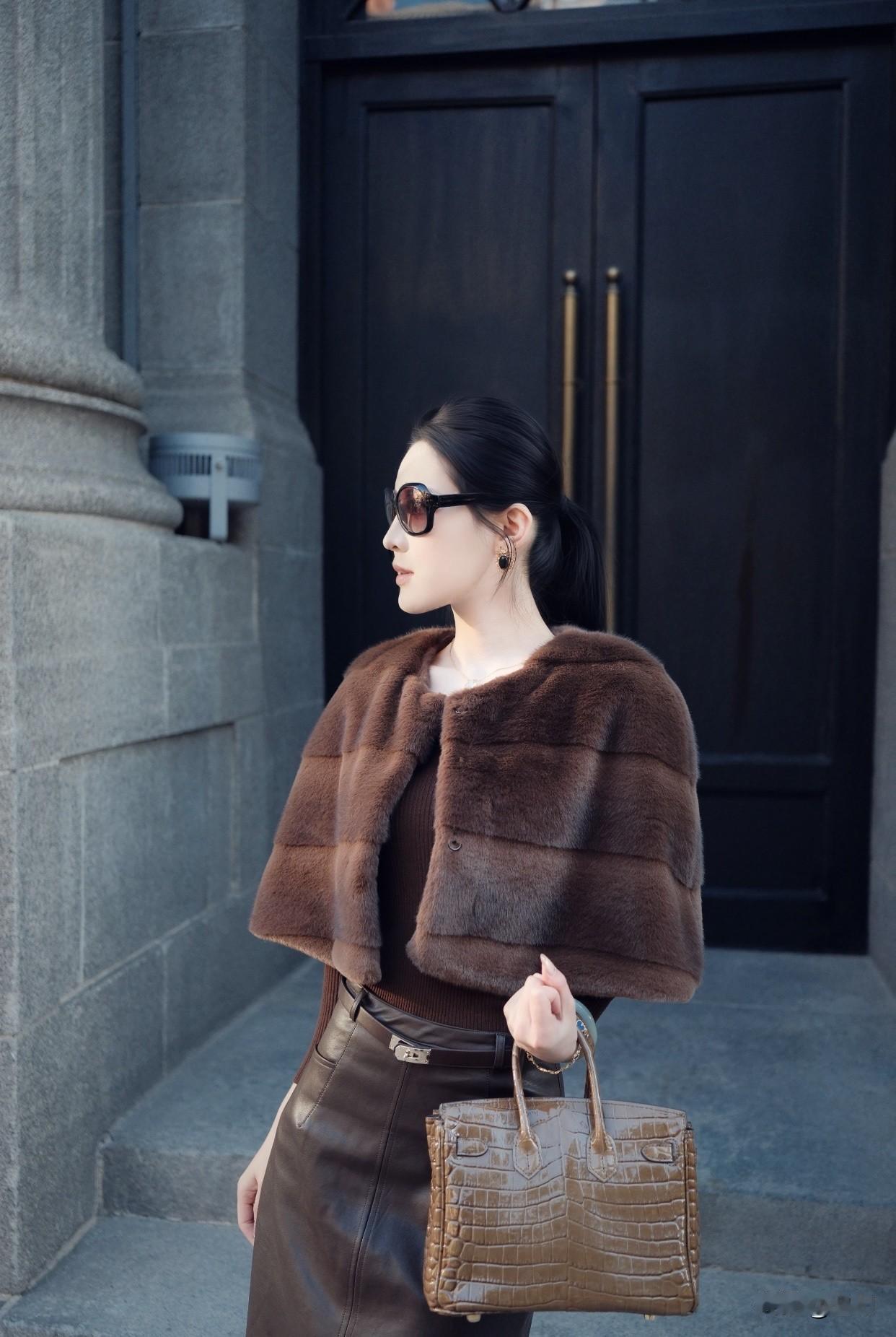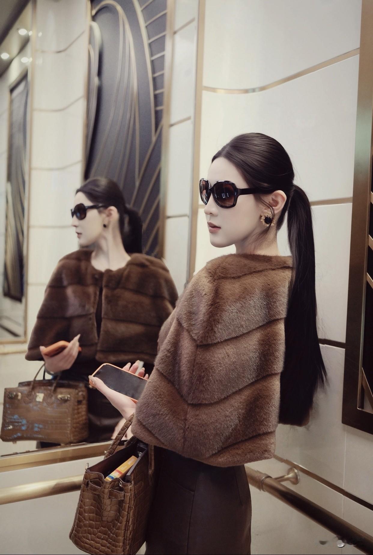 冬季最美穿搭推荐时尚都市女郎,棕色皮草外套,优雅气质,镜中自拍的魅力。