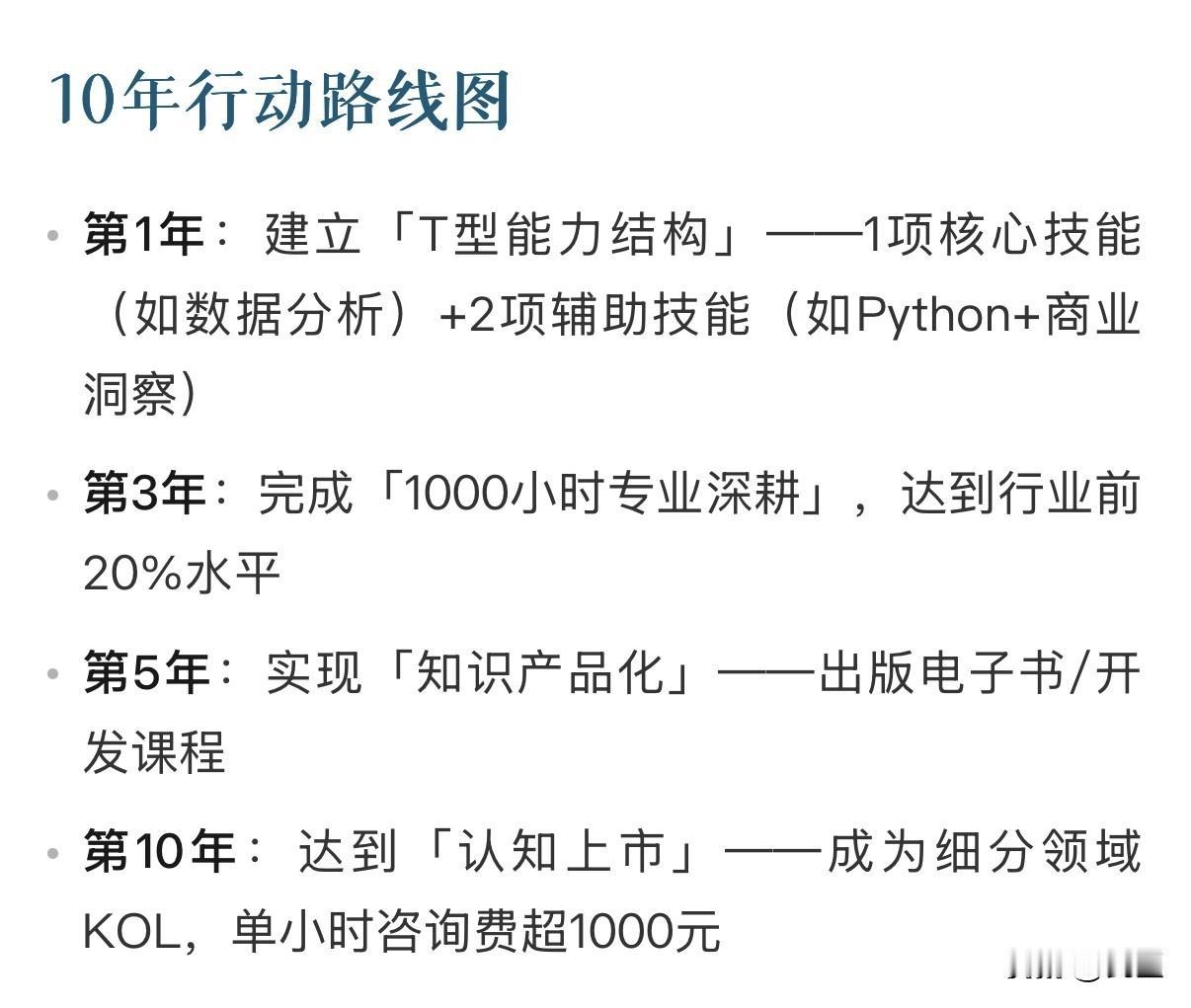 把大脑变成“上市资产”:39.66岁时代的复利行动手册 为什么大脑是“上市资产”? 中央财经大学最新报告显示,2023年中国劳动力平均年龄已达39.66岁。 这意味着: 体力溢价消失:单纯靠时间和体力换钱的时代结束。 认知溢价崛起:知识资本的复利效应开始显现。 代际更替加速:35岁危机提前到30岁,不进化就被淘汰。 10年行动路线图: 第1年:建立「T型能力结构」——1项核心技能(如数据分析)+2项辅助技能(如Python+商业洞察)。 第3年:完成「1000小时专业深耕」,达到行业前20%水平。 第5年:实现「知识产品化」——出版电子书/开发课程。 第10年:达到「认知上市」——成为细分领域KOL,单小时咨询费超1000元。 创业复利 职场复利 财富周期 技能复利 年轻人价值排序
