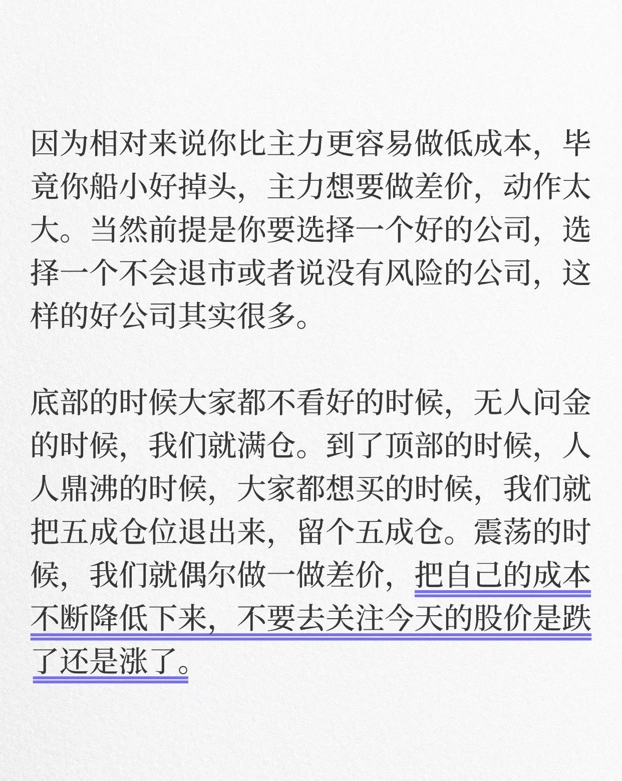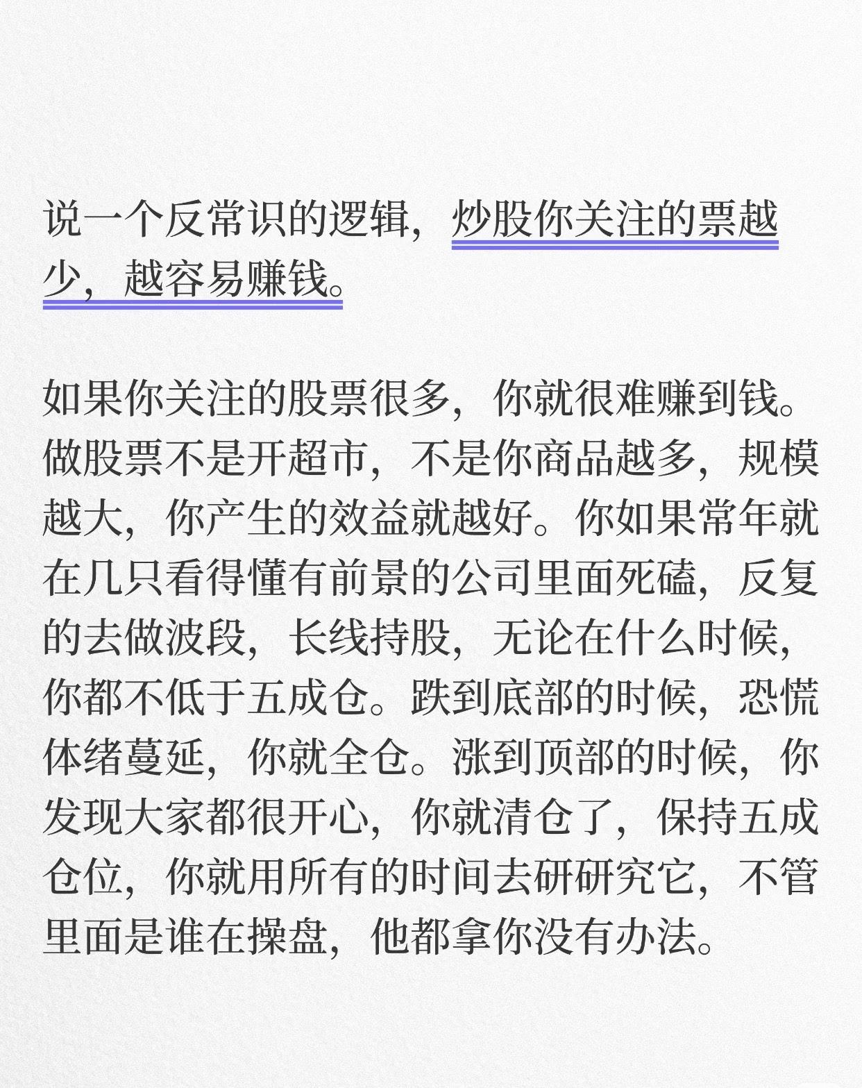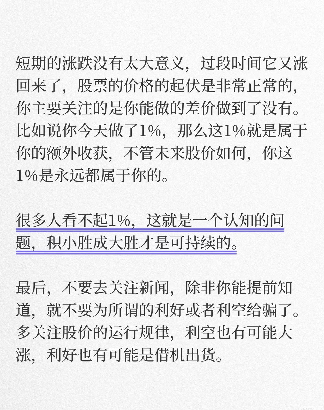 聚焦少而精标的、逆向操作与精细化管理的实用策略,核心观点如下: 首先提出反常识逻辑——炒股关注的股票越少越容易赚钱。原因在于关注过多股票难聚焦,做股票不像开超市靠商品多、规模大出效益,而应常年专注几只看懂且有前景的公司,反复做波段、长线持股,无论何时仓位不低于五成,底部恐慌时全仓,顶部人气高涨时清仓至五成并持续研究,让操盘者难以左右节奏。 其次强调散户相对主力资金的灵活优势:散户“船小好掉头”,更易通过操作做低成本(主力因规模大调仓成本高、易引市场注意),但前提是选优质、基本面好且无退市风险的公司。具体操作中,底部众人都不看好、无人问津时果断满仓;顶部人人鼎沸、都想买入时卖出半仓锁定利润,保留半仓;震荡行情里抓住机会高抛低吸降成本,不必过分在意短期每日涨跌,着眼长期平均成本优化。 最后补充对短期波动与投资心态的看法:短期股价起伏属正常,无需过度关注,重点是能否做出差价——比如当日实现1%的收益,便是确定的额外收获,无论后续股价如何,这笔收益已属于自己。同时批评轻视1%收益的心态是认知局限,强调“积小胜成大胜”才是可持续的策略。此外建议不必过分关注新闻(除非能提前获知),避免被利好利空误导,更应关注股价自身运行规律——利空可能伴随主力拉高而大涨,利好也可能是出货的掩护。 整体传递出聚焦少标的、逆向布局、精细化管理成本、重视确定小收益及遵循股价规律的理性投资理念。