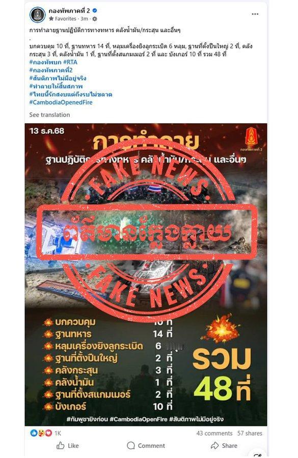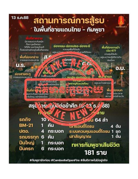 泰国第二军区司令部发布最新战报:181 名柬埔寨士兵阵亡 到13 日泰占领数个关键地区,并在达门-达桂地区摧毁了48个柬方军事基地,泰方控制了战局并持续反击 柬埔寨国防部反驳,称泰军在造谣,见视频 柬方证实14日上午泰军对柬军和平民发动攻击 图1泰军插旗,图2、3为柬军辟谣