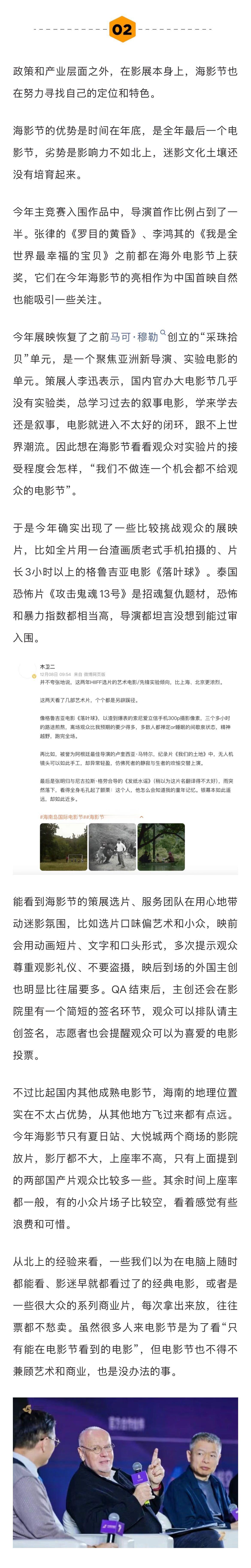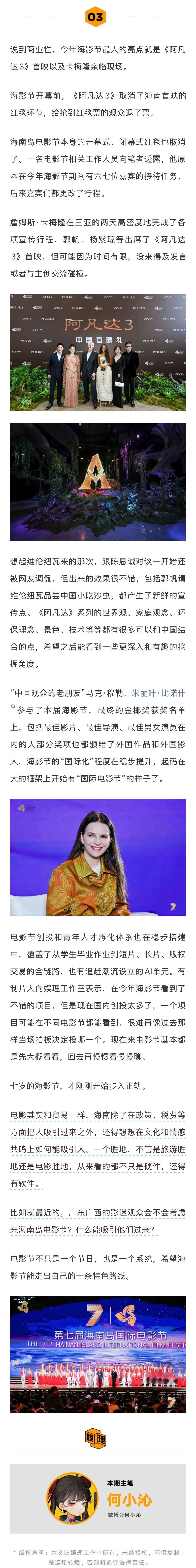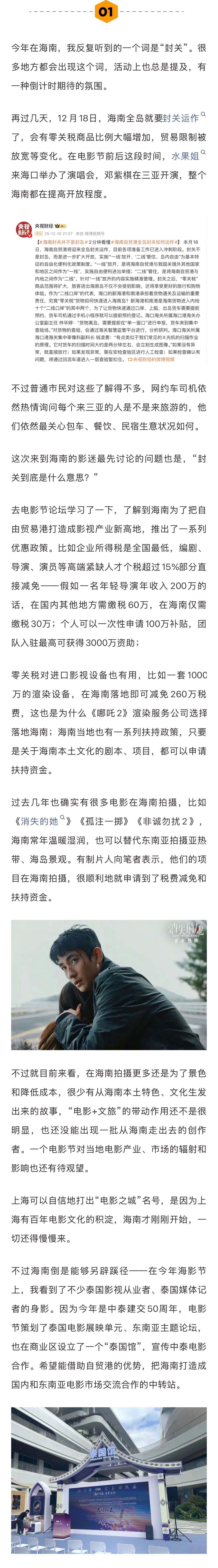 海南岛电影节正在步入正轨今年的海南岛电影节有哪些变化 在今年海影节上,看到了不少泰国影视从业者、泰国媒体记者的身影。今年是中泰建交50周年,电影节策划了泰国电影展映单元、东南亚主题论坛,还设立了“泰国馆”,宣传中泰电影合作。希望能借助自贸港的优势,把海南打造成国内和东南亚电影市场交流合作的中转站。娱理独家↓