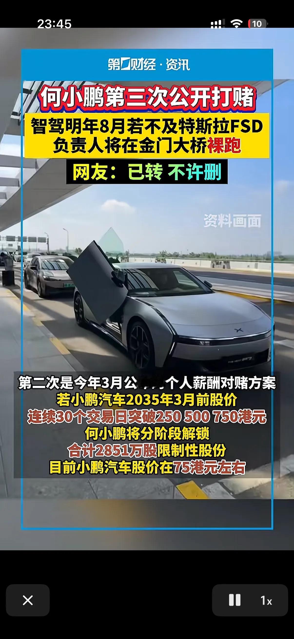 就问一下小鹏公司有多少负责人啊! 昨天何小鹏又打了个惊天大赌那就是如果到了2026年八月份小鹏公司的智驾系统还是赶不上特斯拉的fsd,那么小鹏公司的负责人可就要在金门大桥来个裸奔了! 咱就说看热闹不嫌弃事大,网友们纷纷转发和保存何小鹏的视频! 就希望明年八月份的时候无论小鹏公司的智驾系统能不能赶得上特斯拉的fsd智驾系统,何小鹏都能依约而行! 不然公司的公信力可就彻底完犊子了! 不过乐子人们肯定会开心坏了!