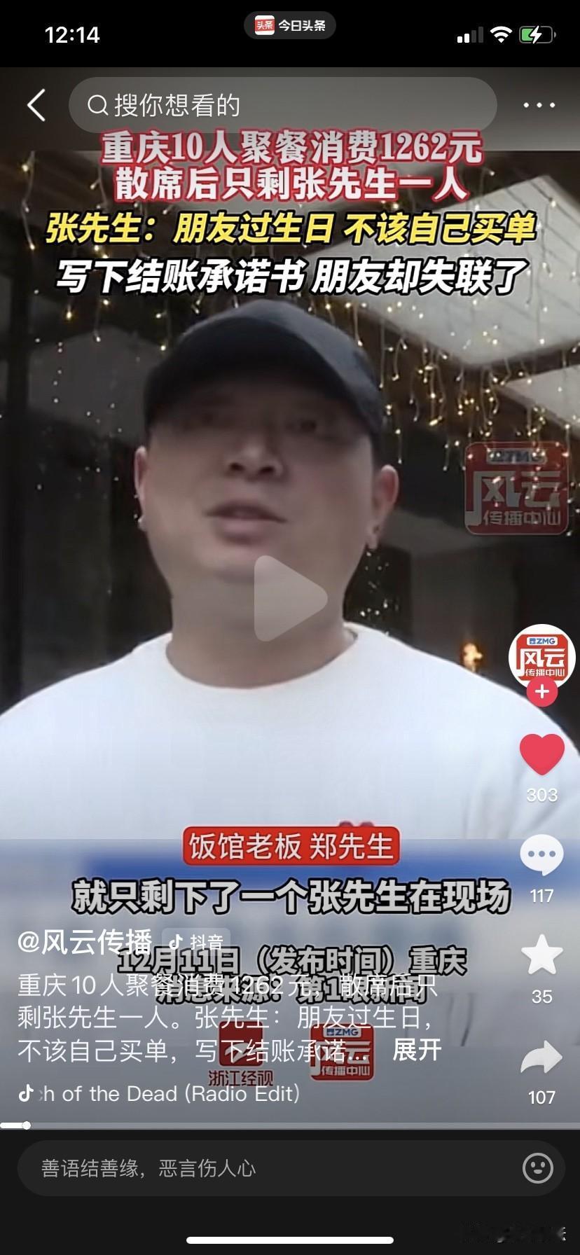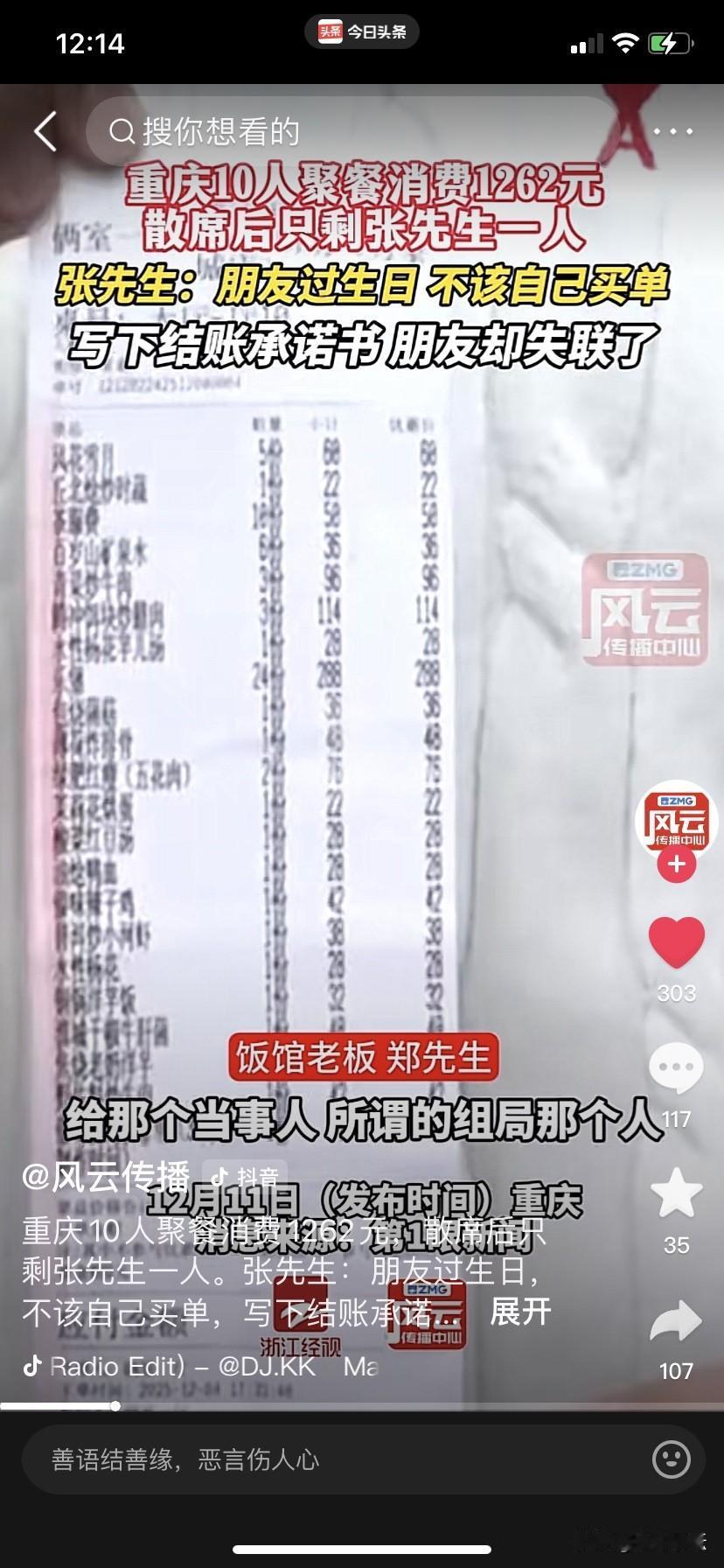 重庆10名男子就餐后拒绝付款让重庆人丢大发了 2025年12月12日,在重庆一某饭店里有10名年轻人在一起聚餐,中途有九个人先后找理由离开了,最后只剩下张先生一个人,当服务员拿着1260元的账单找张先生付款时,张先生却拒绝付款,还理直气壮地说:是朋友过生日叫我来的,聚餐又不是我组织的,凭什么让我当冤大头?无奈饭店老板只好选择了报警。 在警方的调解下,张先生和饭店签订了结账承诺书。但是过了两天,饭店老板郑先生并没有收到张先生的付款,饭店老板准备将十名名男子一同起诉。 知名律师称:签字人承诺具有法律约束十个人均有付款义务。 通过这起事件证明,这十个人平时关系是互相不信任,互相耍心眼。既然最后张先生给饭店签订了付款协议,就应该先把钱付给老板,然后再找那九个人算账,如果他们不给,就认清了这九个人的嘴脸,从此以后和他们断交,让饭店老板起诉自己会被拉入失信人名单,这样会给自己的生活带来很多麻烦,实在划不来。