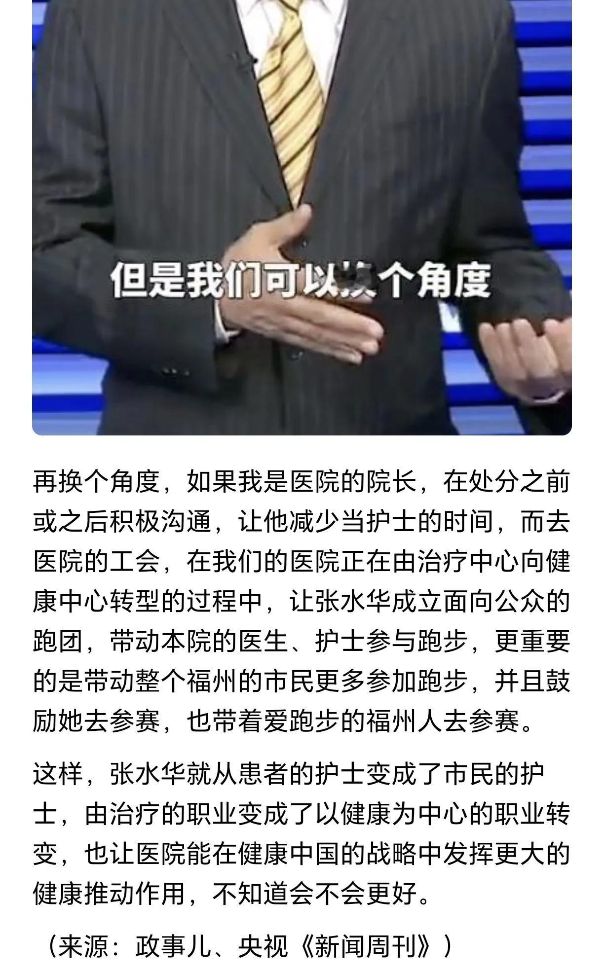 白岩松的点评完全是脱离实际,也不接地气。 目前国内基层一线医护人员是公认的人手不足、工资不高、劳动强度大,尤其是公立医院。 张水华为了个人爱好,频繁请假,她的工作就要分担到其他人头上,比如轮流值夜班之类的。这对医院的正常管理和患者的权益本身就有影响。 医院按照规章制度处分她本身就是正确的,她要是真的那么喜欢就干脆辞职去跑好了。 至于说的什么带动本院医护、更多市民一起去跑步更是不切实际。 现在多少人长期加班加点工作到深夜、下班后做兼职送外卖养家的,下班后累成狗的是大多数,能有点时间去娱乐休息就不错了。 白岩松