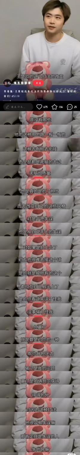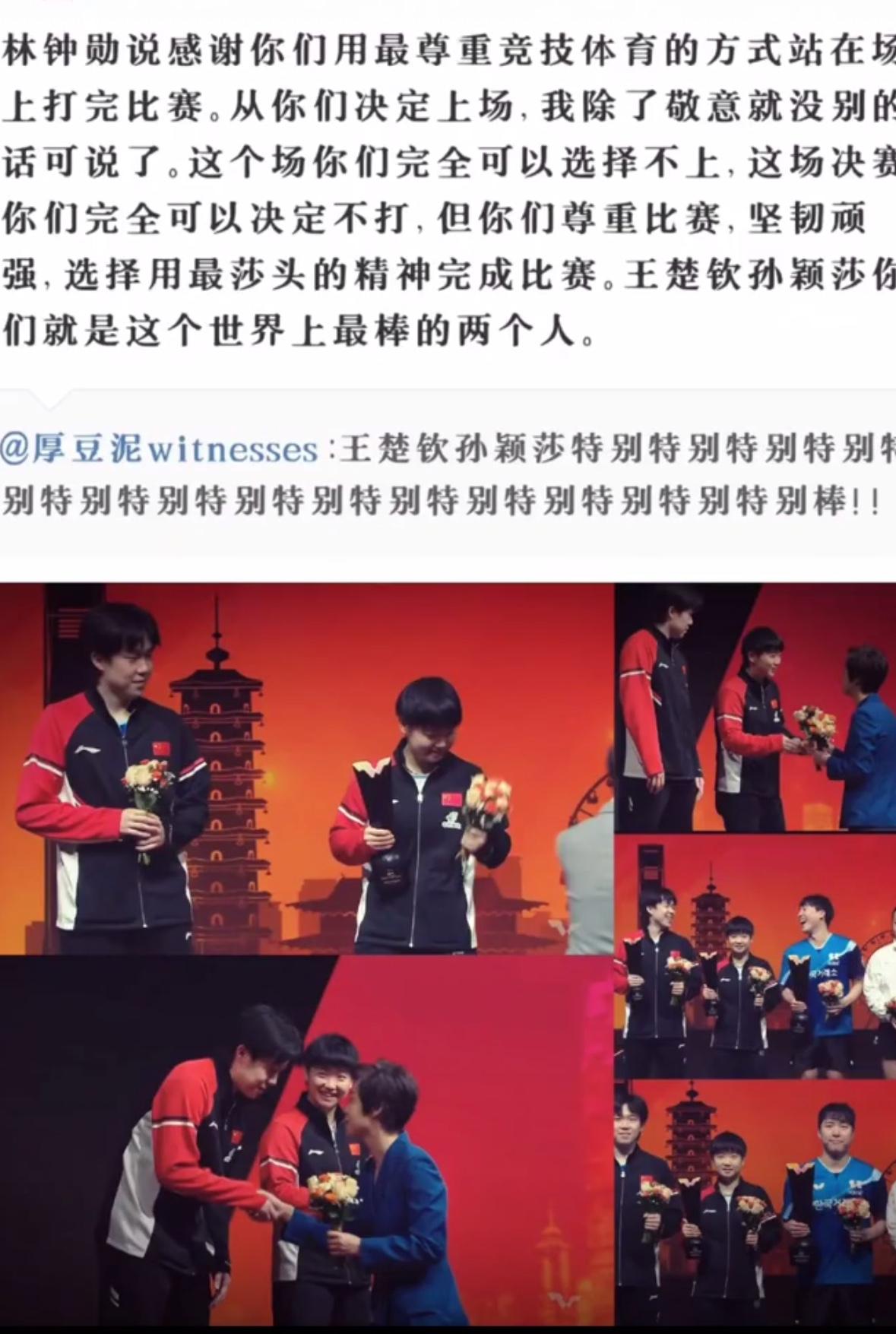 刘国正指导谈香港总决赛混双决赛 王楚钦主动承担了大部分责任 香港总决赛,混双莎头组合 获得亚军,莎莎赛前受伤, 比赛中,王楚钦承担了责任, 从技战术上选择加满质量, 会冒很多风险, 也会有很多失误, 但这就是王楚钦的担当, 他知道莎莎受伤了, 不想让莎莎多跑动, 尽可能选用一板过的打法, 搏杀赢了算两个人的, 输了,大家怨他! 这就是王楚钦的担当, 这就是莎头精神, 顶级的孙颖莎, 顶级的王楚钦, 顶级的搭档!