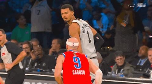 文班单打卡鲁索成功,手指着他,嘴里念念有词:im bigger than you,you little biiiiitch(你个小不点儿,@¥*…) 文班亚马几次错位卡鲁索,可后者顶他下盘,使小动作,切他球,号称猛男的卡鲁索也没任何办法。
